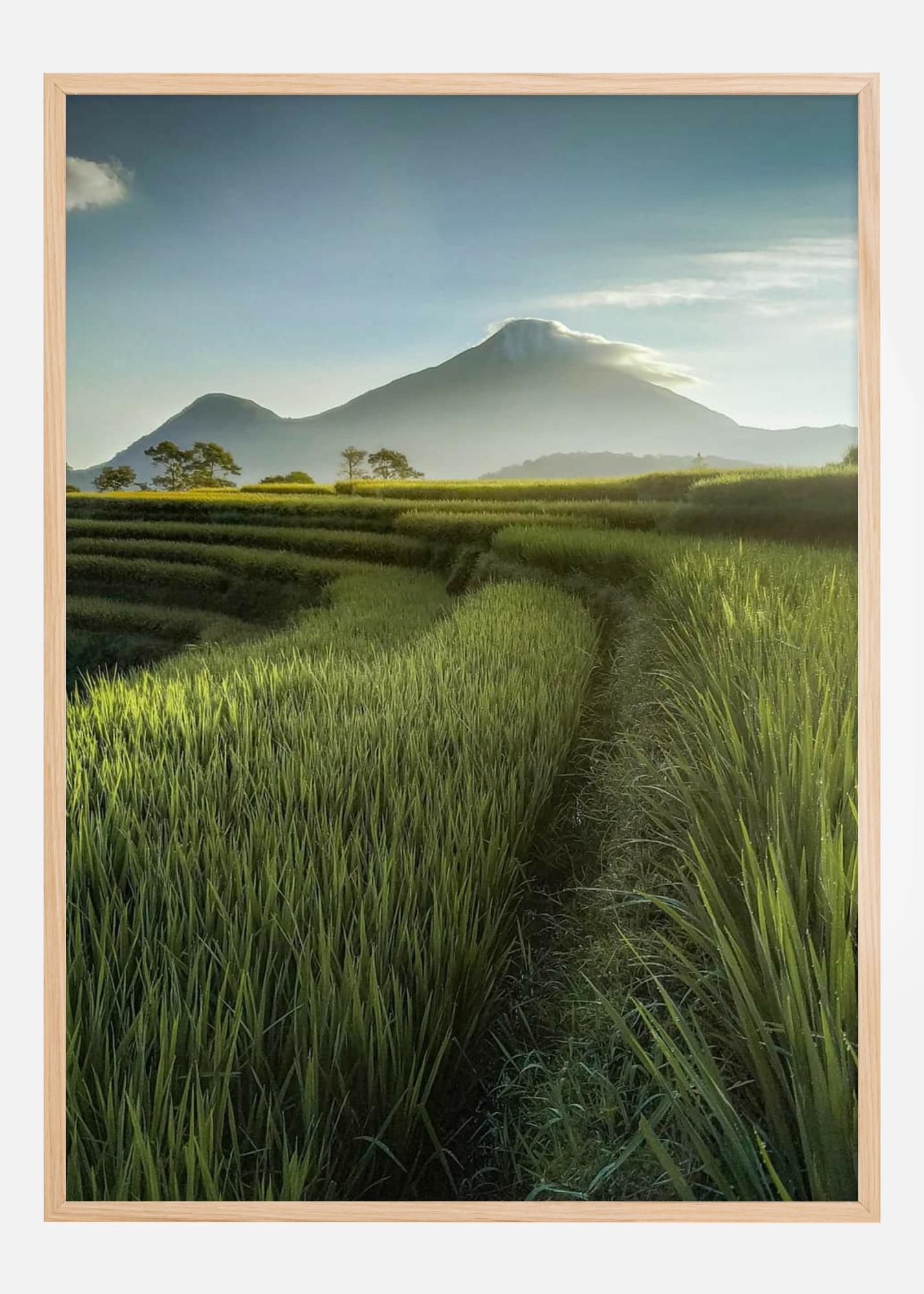 Ce poster offre un aperçu d'une idylle pastorale, où des rizières vertes s'étendent sur un fond de montagnes majestueuses et un ciel doux. La lumière qui inonde le paysage procure une sensation chaleureuse et accueillante, ce qui fait de cette impression un moyen parfait d'introduire un morceau de calme et de beauté de la nature dans votre maison ou votre lieu de travail.