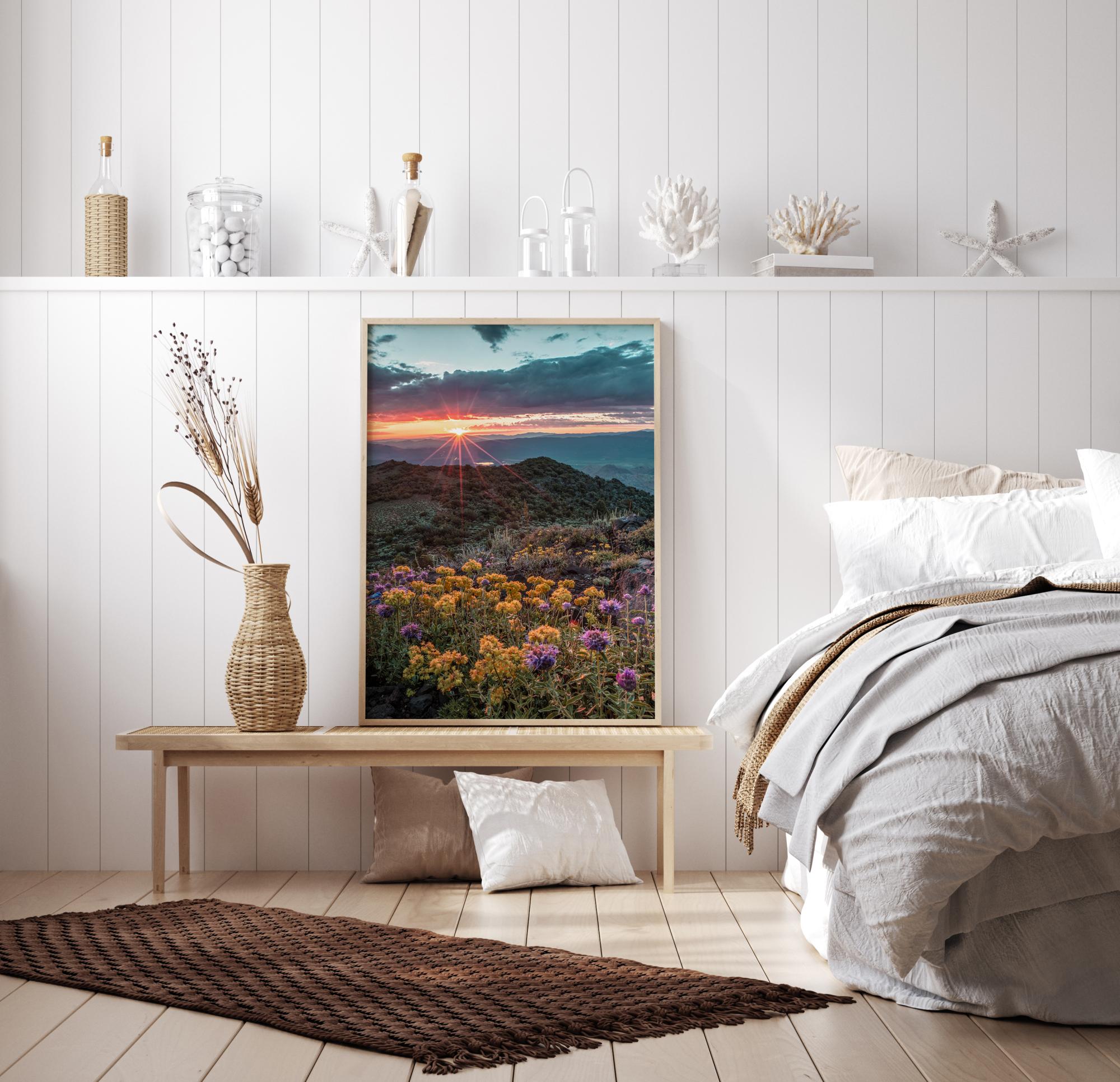 Une affiche nature représentant des fleurs sauvages sur un flanc de montagne avec un superbe coucher de soleil. De magnifiques fleurs jaunes et violettes remplissent l'image et ramènent votre regard vers les sommets des montagnes et le ciel qui s'assombrit. Le coucher de soleil rayonne comme une étoile rouge et constitue un point focal. Ajoutez ce postet à votre mur pour une ambiance naturelle.