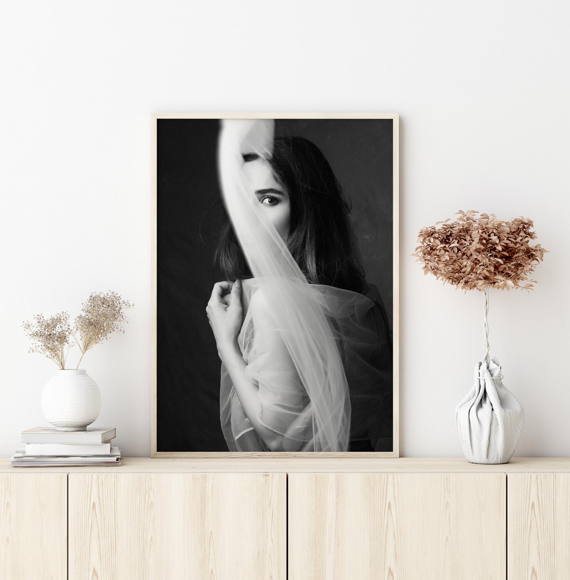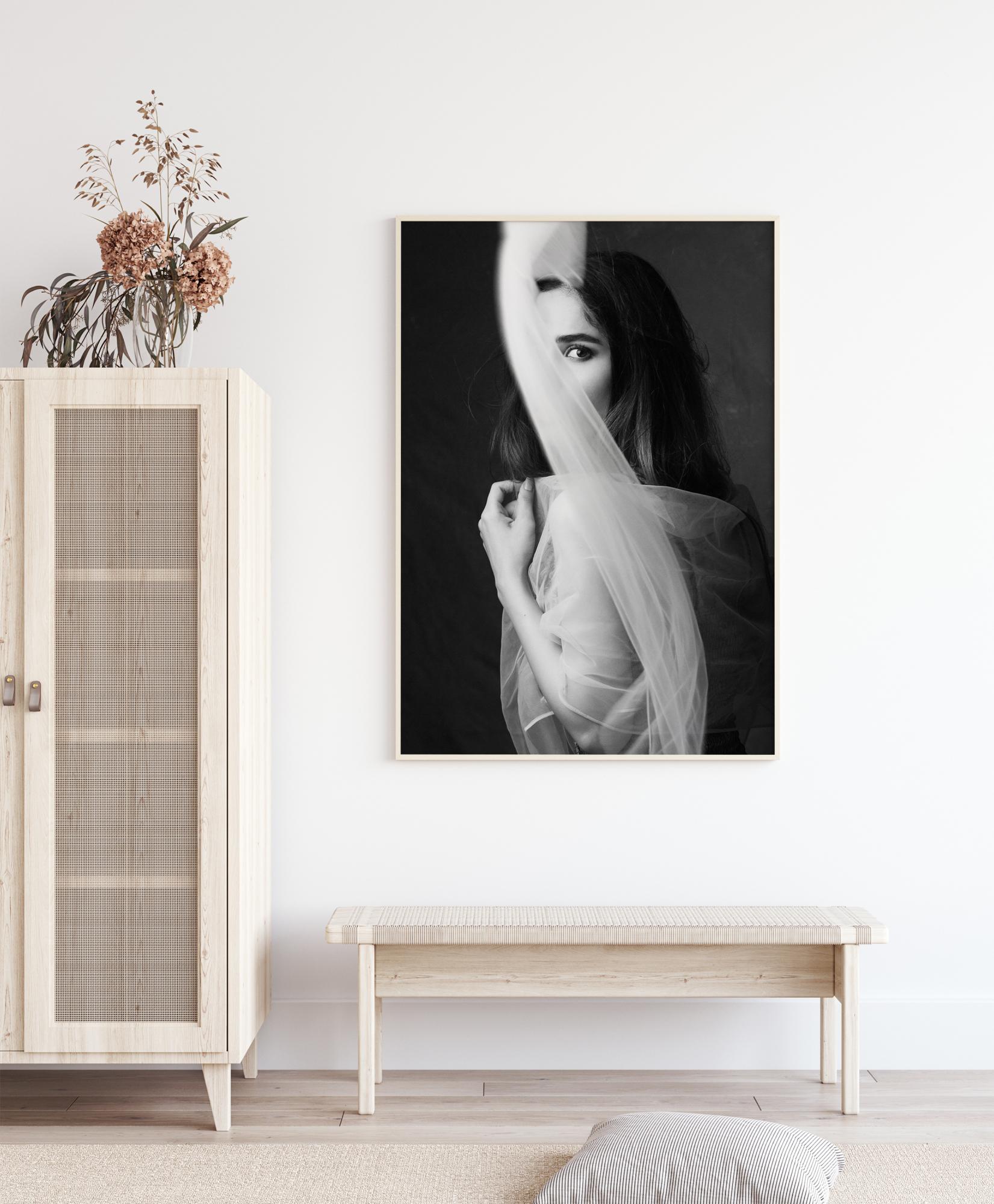 Une affiche éthérée d'une femme qui se cache derrière un rideau. La douceur du rideau attire le regard vers le haut pour tomber nez à nez avec l’oeil de la femme. Connectez-vous avec elle dans un lieu de paix.