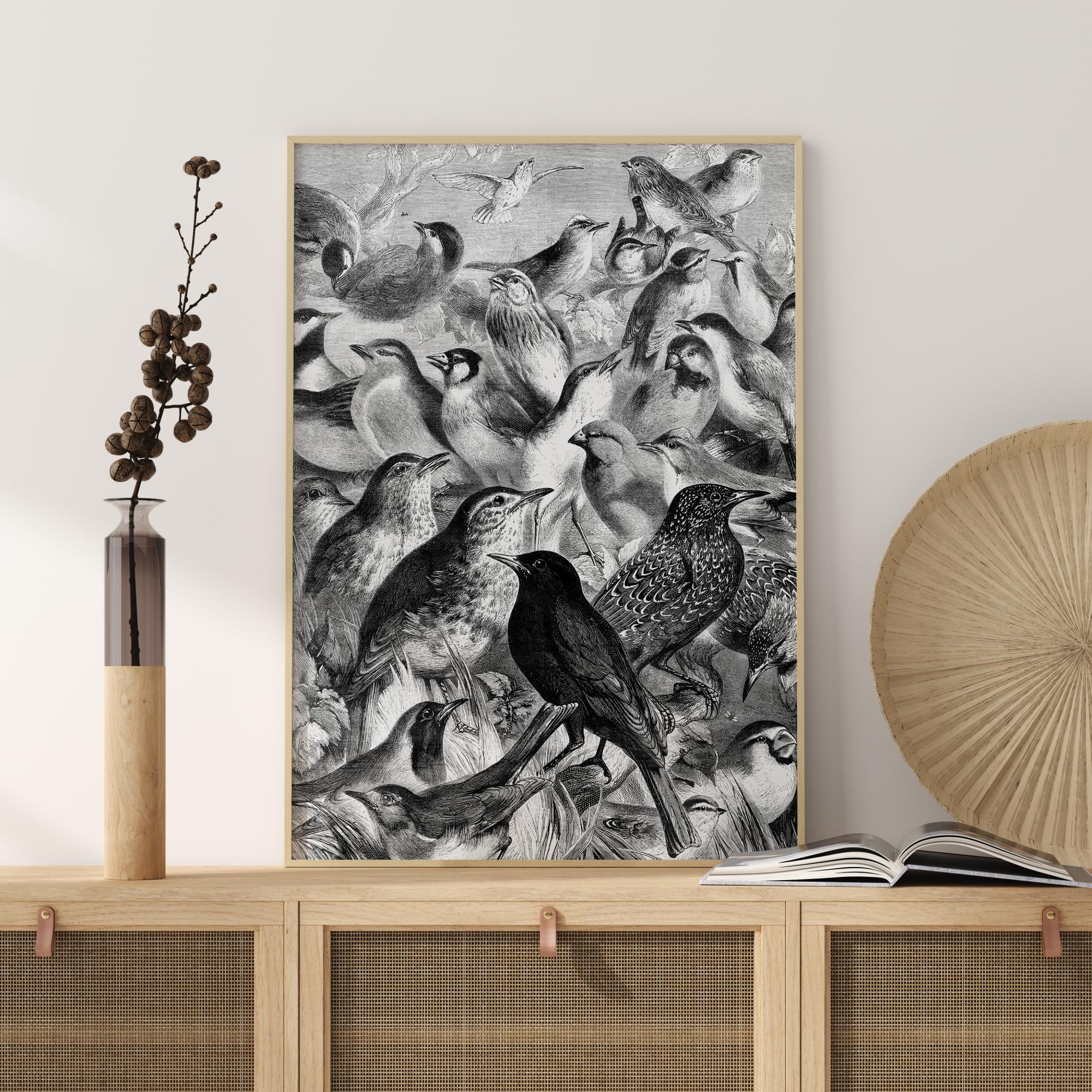 Une affiche en noir et blanc de divers oiseaux. Apprenez tout ce qu'il faut savoir sur les oiseaux grâce à cette image de style imprimé présentant des oiseaux britanniques indigènes. Occupez-vous en découvrant les oiseaux de l'image et apprenez à les reconnaître. Faites-les ressortir encore plus sur un mur de couleur vive de votre maison.