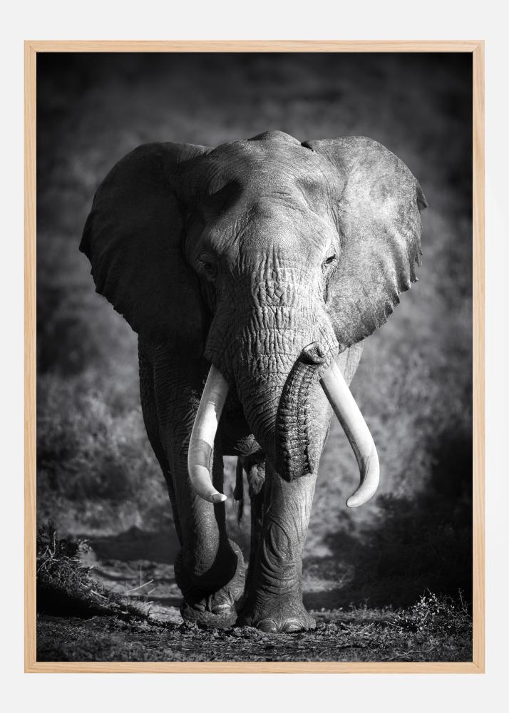 Cette affiche puissante et captivante dépeint un éléphant en noir et blanc, mettant en valeur la peau ridée et les grandes défenses de cette créature magnifique. La présence digne de l'éléphant est capturée en détail, et son regard paisible offre un sentiment de sagesse et d'intemporalité. Cette image est parfaite pour quiconque apprécie la faune et la beauté puissante de la nature et souhaite ajouter un élément expressif et stimulant à son domicile ou à son bureau.