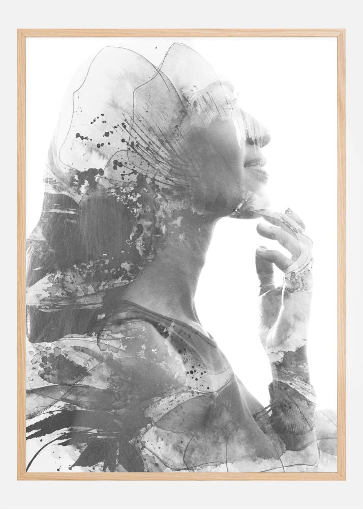 Cette affiche artistique montre une image en double exposition d'une femme de profil, dont la forme se fond avec des éclaboussures d'encre abstraites et des motifs aquarelle dans une palette noir et blanc. L'image est une fusion captivante de l'humain et de l'art, capturant la beauté de la réflexion féminine et la nature éphémère de la créativité. Cette œuvre d'art serait un ajout audacieux et stimulant dans tout intérieur moderne.