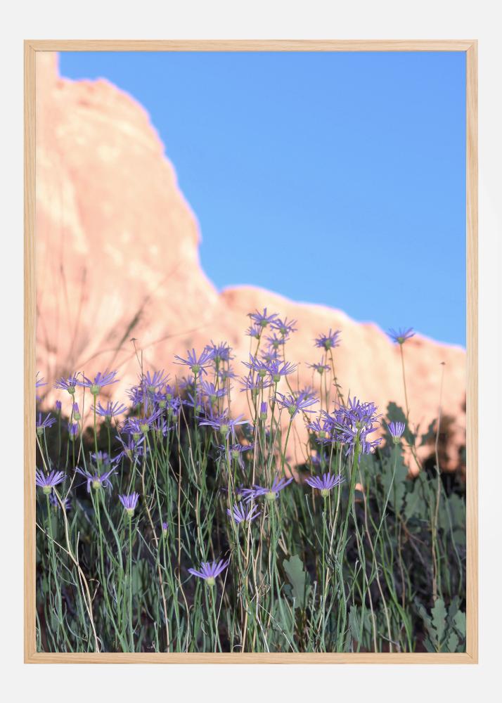 Une affiche nature éblouissante avec des fleurs violettes, des montagnes rocheuses et un ciel d'un bleu intense. Les bleuets pourpres sont au centre de l'image, s'élevant vers le ciel et mettant en valeur les rochers orange et le vaste ciel. Perdez-vous dans la nature en ramenant ce poster chez vous. Accroche- le dans votre chambre.