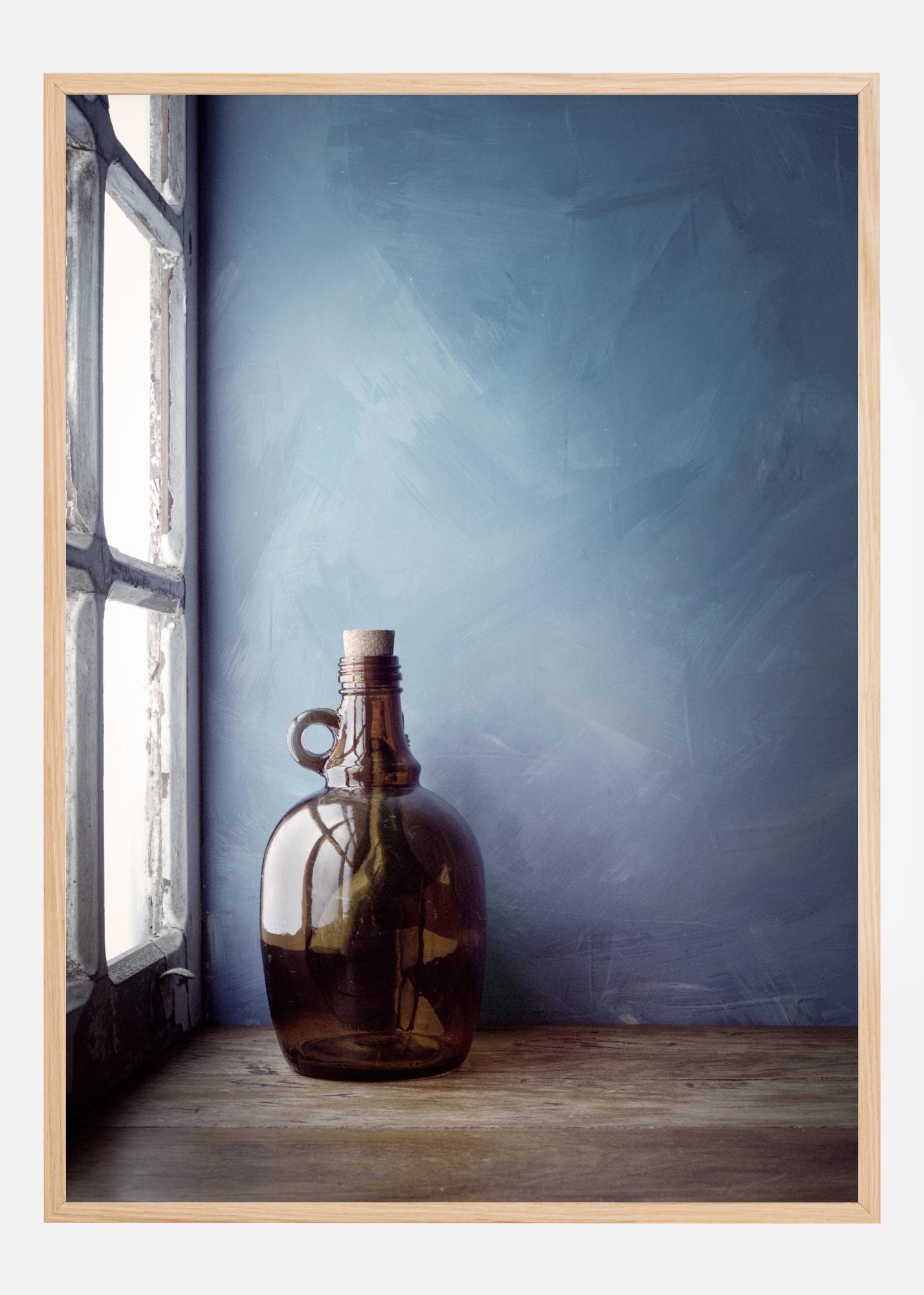 Affiche d'une nature morte avec une bouteille brune contre un mur bleu. La lumière d'une fenêtre entre par la gauche, éclairant la bouteille et projetant des reflets. Ajoutez une touche rustique à votre intérieur avec le mur bleu doux et la vieille table en bois sur laquelle repose la bouteille.