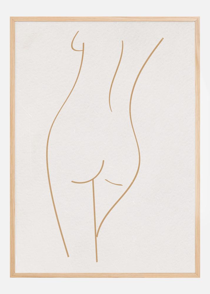 Un dessin au trait simple du dos d'une femme. De fines lignes brunes suffisent à créer la forme d'une femme posant de dos. Les lignes attirent le regard vers le haut de son dos dans cette affiche simple mais élégante sur un fond blanc.