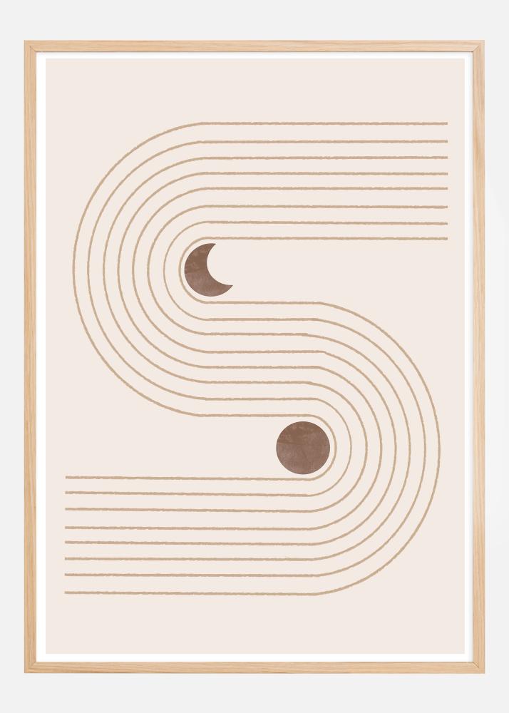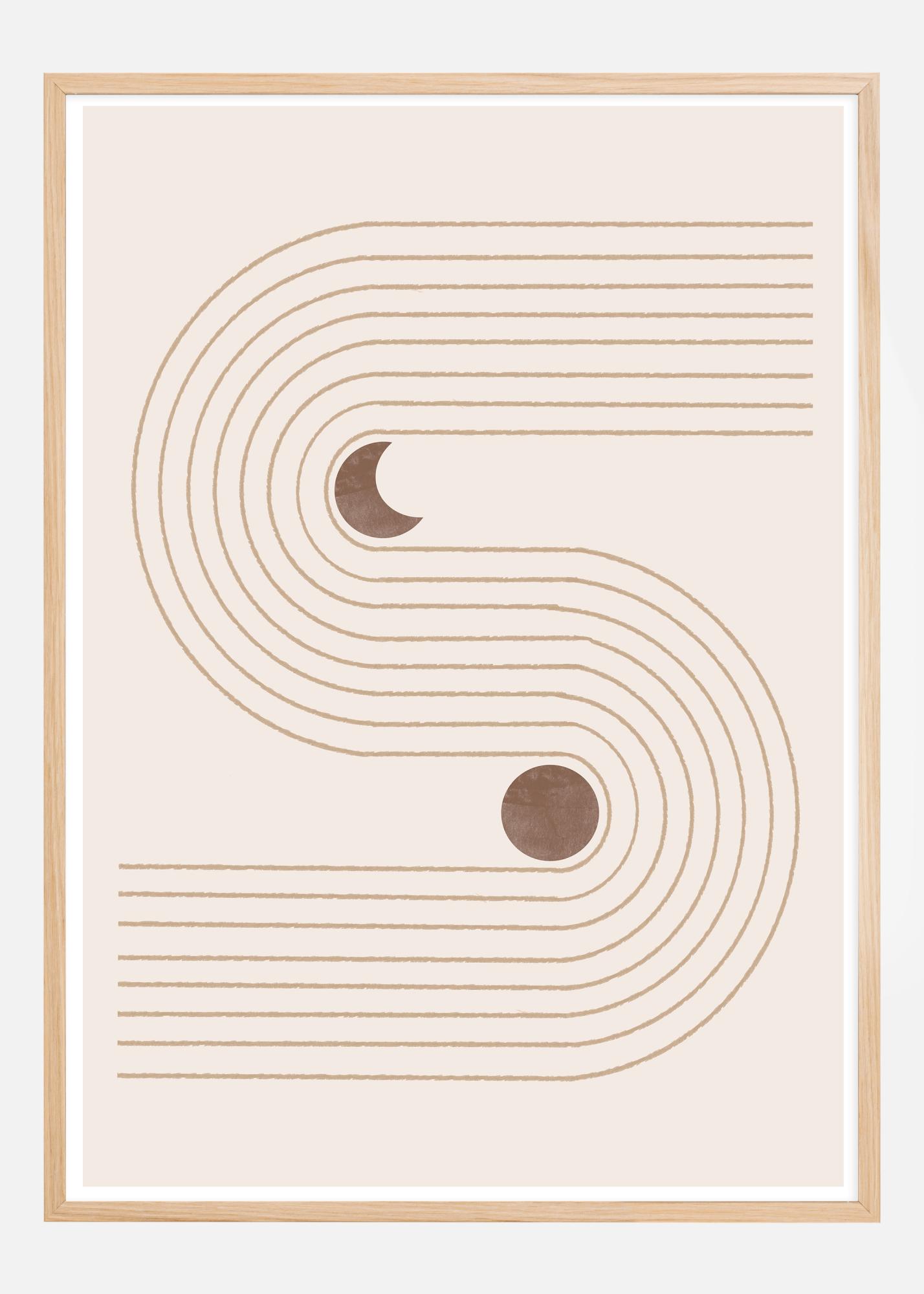 Ce poster offre une interprétation minimaliste des formes bohèmes et des corps célestes avec ses arcs et lignes fluides formant un motif harmonieux. Il présente une palette apaisante de nuances terreuses, avec des touches de cercles brun foncé qui peuvent représenter des lunes ou des planètes, apportant une touche cosmique au design. Les arcs donnent une sensation de mouvement et de fluidité, tandis que les formes rondes ajoutent un élément d'équilibre et de symétrie.