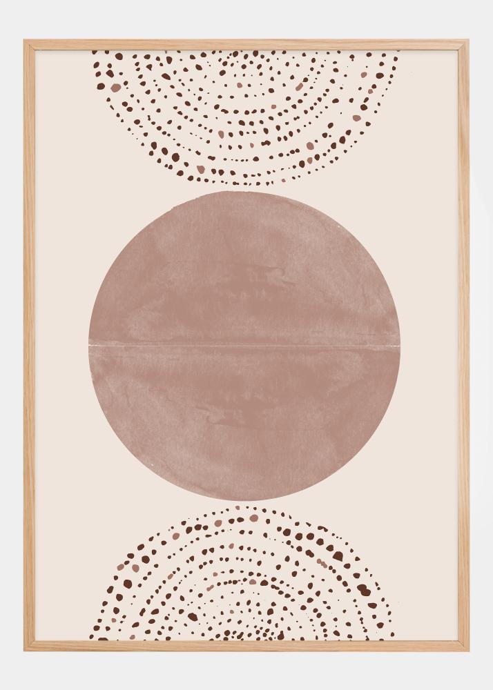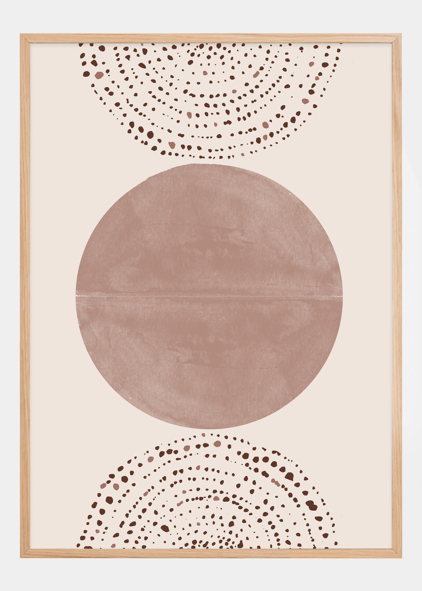 Ce poster sophistiqué et apaisant met en avant un grand cercle doux couleur terracotta au centre d'une composition de petits points dispersés formant des demi-cercles flottants en haut et en bas. Ce motif est inspiré de la conception bohème et apporte une ambiance décontractée et terreuse tout en ajoutant une touche moderne à la pièce qu'il orne.