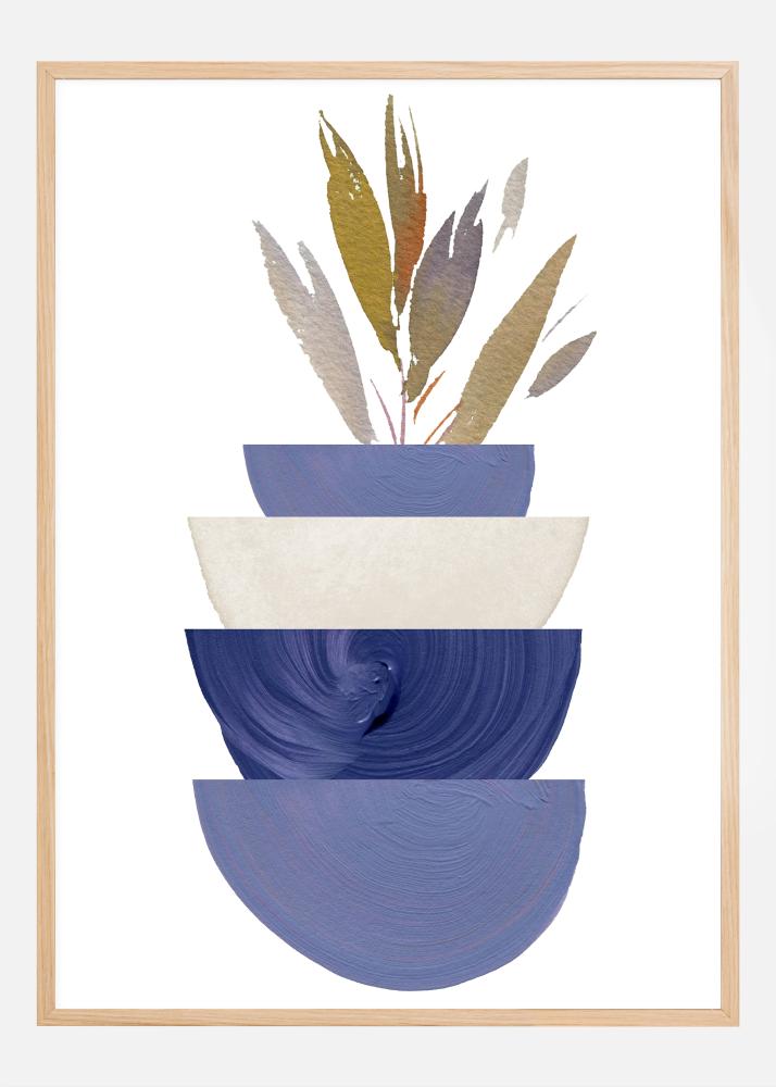 Du centre du bol supérieur s'élèvent des formes abstraites qui rappellent le feuillage ou les plumes, peintes dans des couleurs naturelles telles que vert olive, brun rouille, gris et beige. Les formes organiques, associées aux bols géométriques, créent un contraste unique qui est à la fois satisfaisant pour l'œil et stimulant pour l'esprit. Cette impression combine des éléments de la nature et du design d'une manière qui capture l'essence d'un style bohème moderne, avec une palette de couleurs qui comprend à la fois des tons terreux et des nuances de bleu froid. L'affiche offre un détail élégant et stylé pour toute pièce, que ce soit un salon, une chambre ou un bureau.