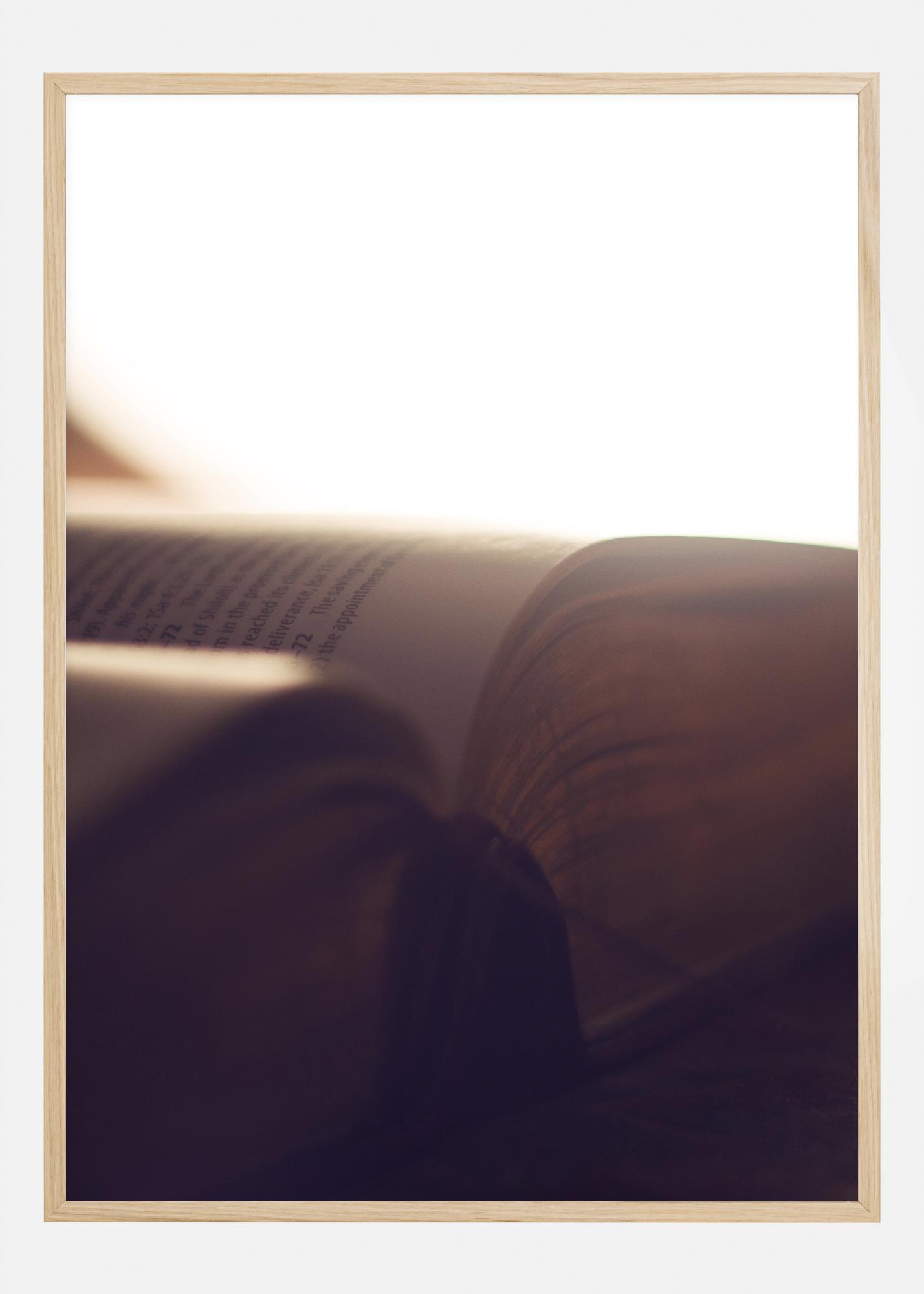 Une affiche en gros plan du côté d'un livre. Une lumière blanche intense remplit la majeure partie de l'image, car elle éclaire le livre en illuminant les bords dorés des pages. Le livre est ouvert et les mots sont visibles sur la page. C'est l'image parfaite pour une salle d'étude.