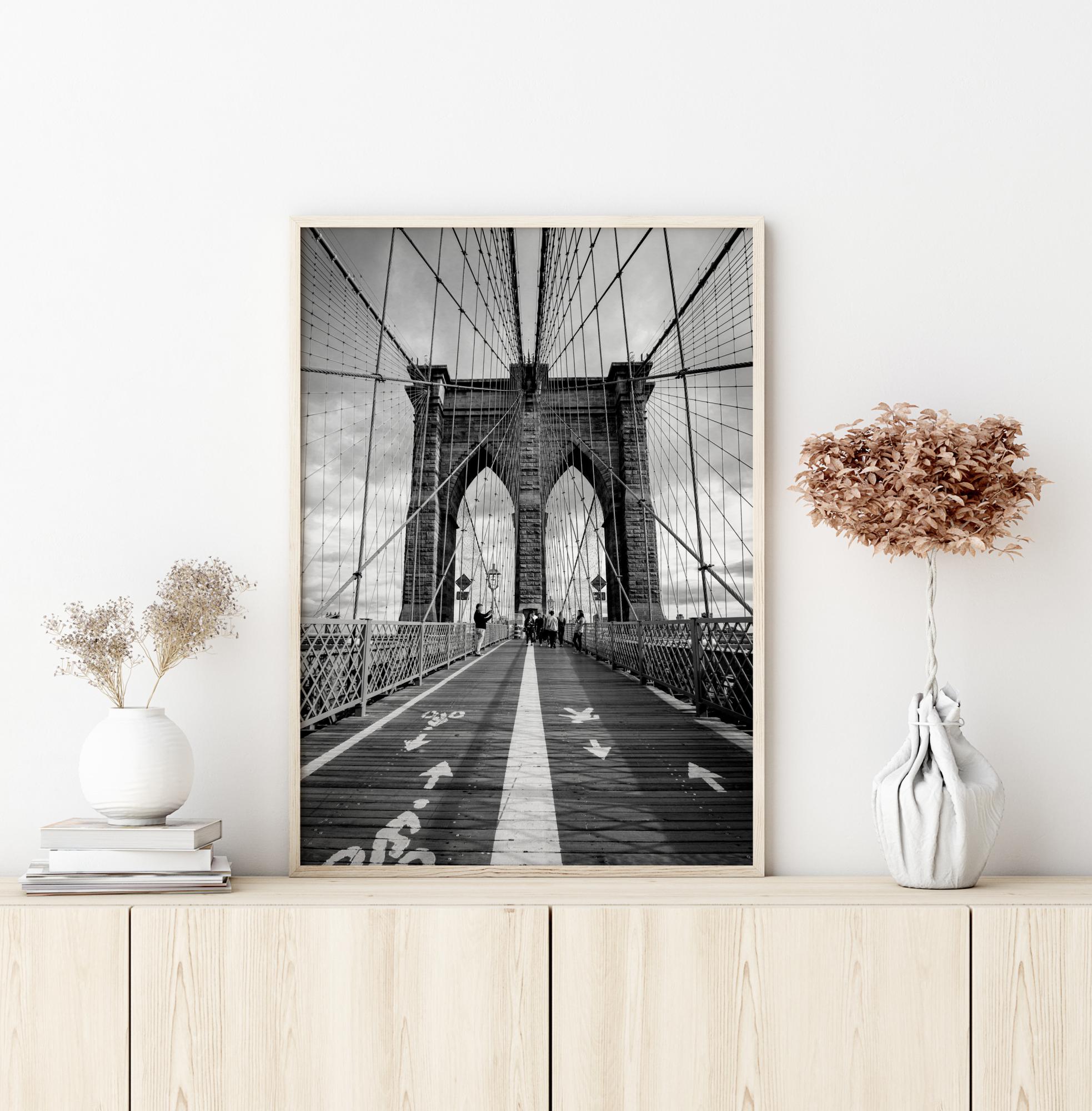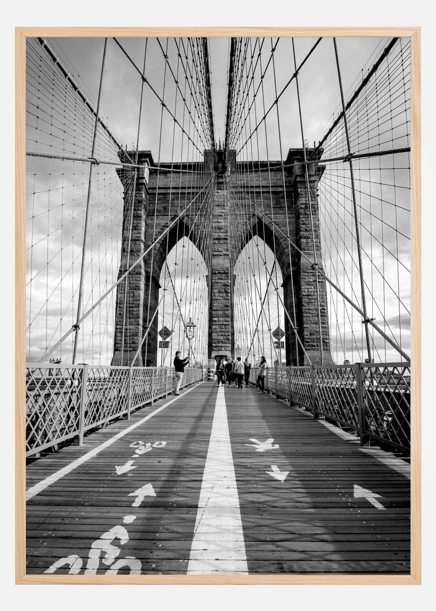 Une photographie en noir et blanc du passage piéton du Brooklyn Bridge, avec ses tours imposantes et son intéressant système de suspension fait de câbles d'acier dans un grand réseau. Un poster qui se marie parfaitement avec d'autres favoris dans un grand collage.