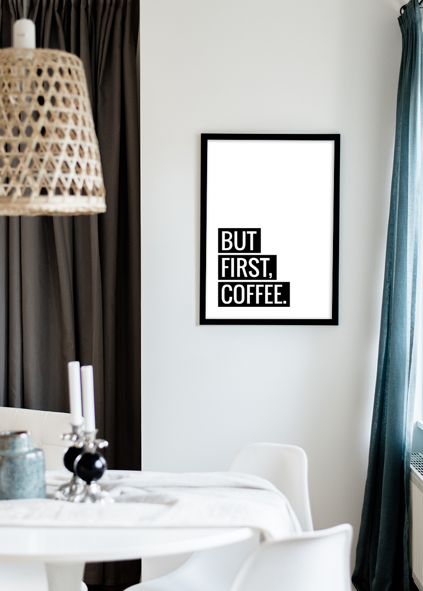 Voyagez autour du monde, lancez votre propre entreprise, apprenez à jongler tout en équilibrant sur une ligne ultrafine ! Mais d'abord – café. Ce poster élégant vous convient si vous voyez cette boisson merveilleuse comme une partie importante de la vie quotidienne. Accrochez-le au-dessus de la table de la cuisine ou au bureau ! Le poster est blanc avec le texte « But first, coffee » en blanc sur fond noir. Le design noir et blanc fonctionne parfaitement avec un cadre ou un passe-partout de couleur vive. Choisissez parmi 6 formats différents.