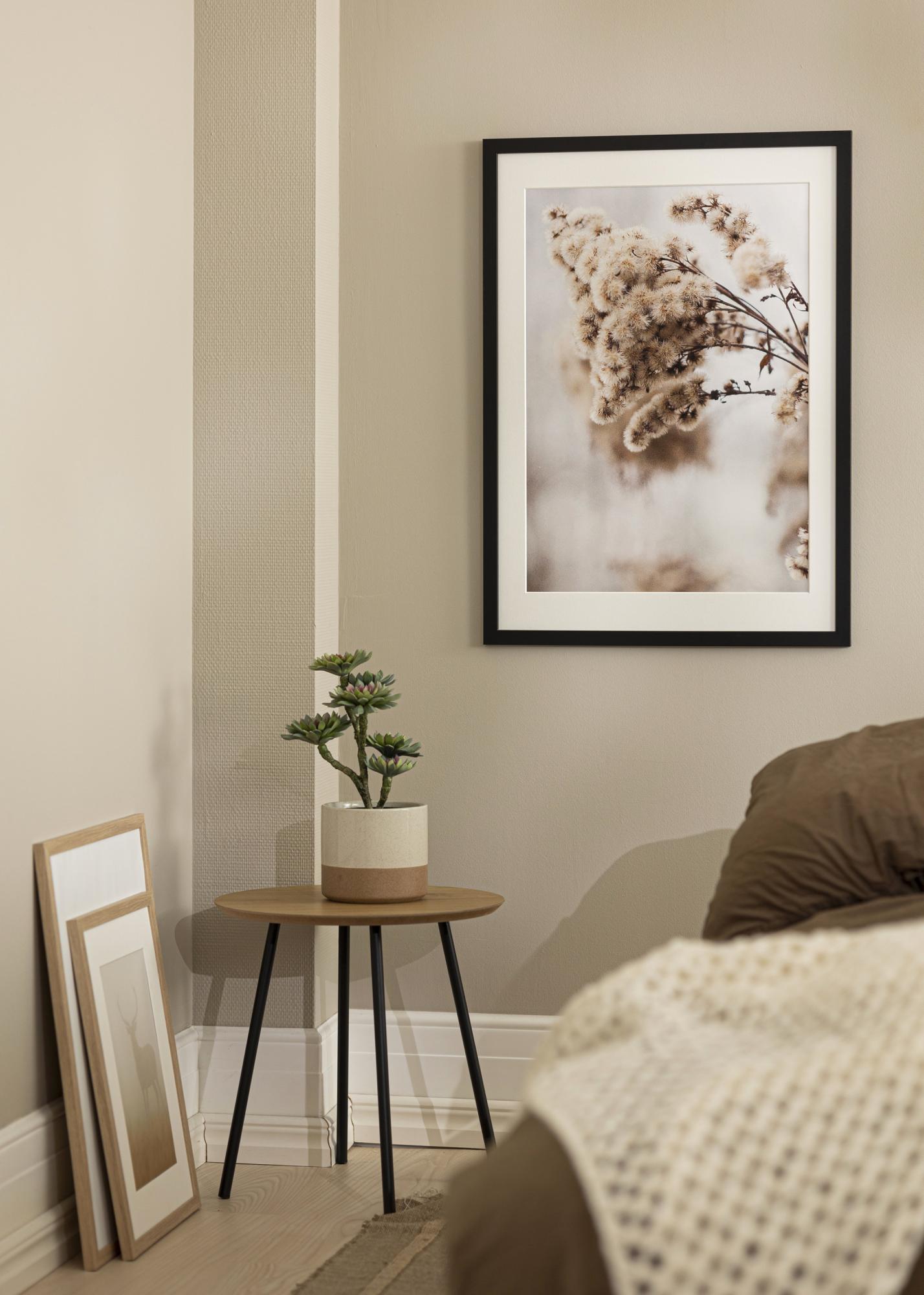 Le cadre a une largeur de 22 mm et une profondeur de 15 mm, ce qui donne une sensation stable et robuste. La surface mate contribue à un design moderne et intemporel qui s'adapte à la plupart des intérieurs. Le passe-partout aide à protéger l'image d'un contact direct avec le verre, ce qui réduit le risque de dommages et préserve la qualité de l'image dans le temps.