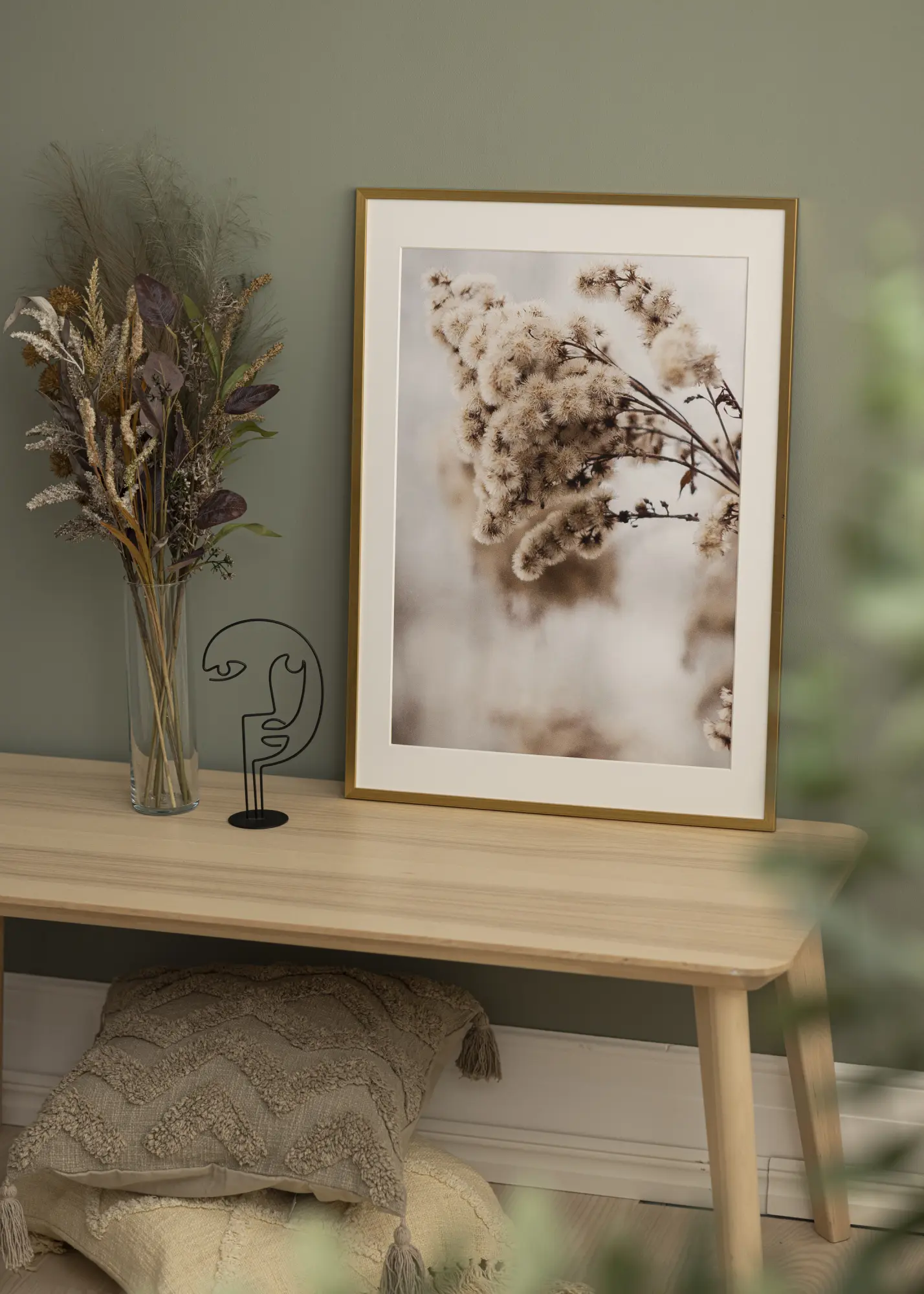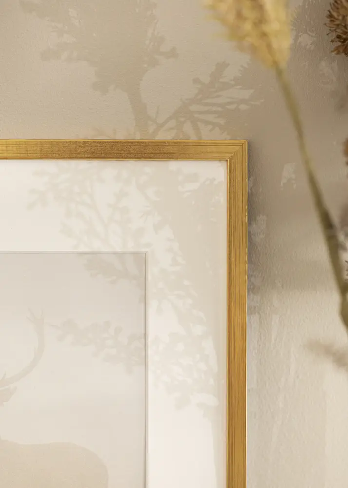 Ce cadre élégant en or est doté d'un passe-partout qui convient aux images de taille 32x37 cm. Avec une largeur de 13 mm et une profondeur de 11,5 mm, il offre un encadrement épuré.