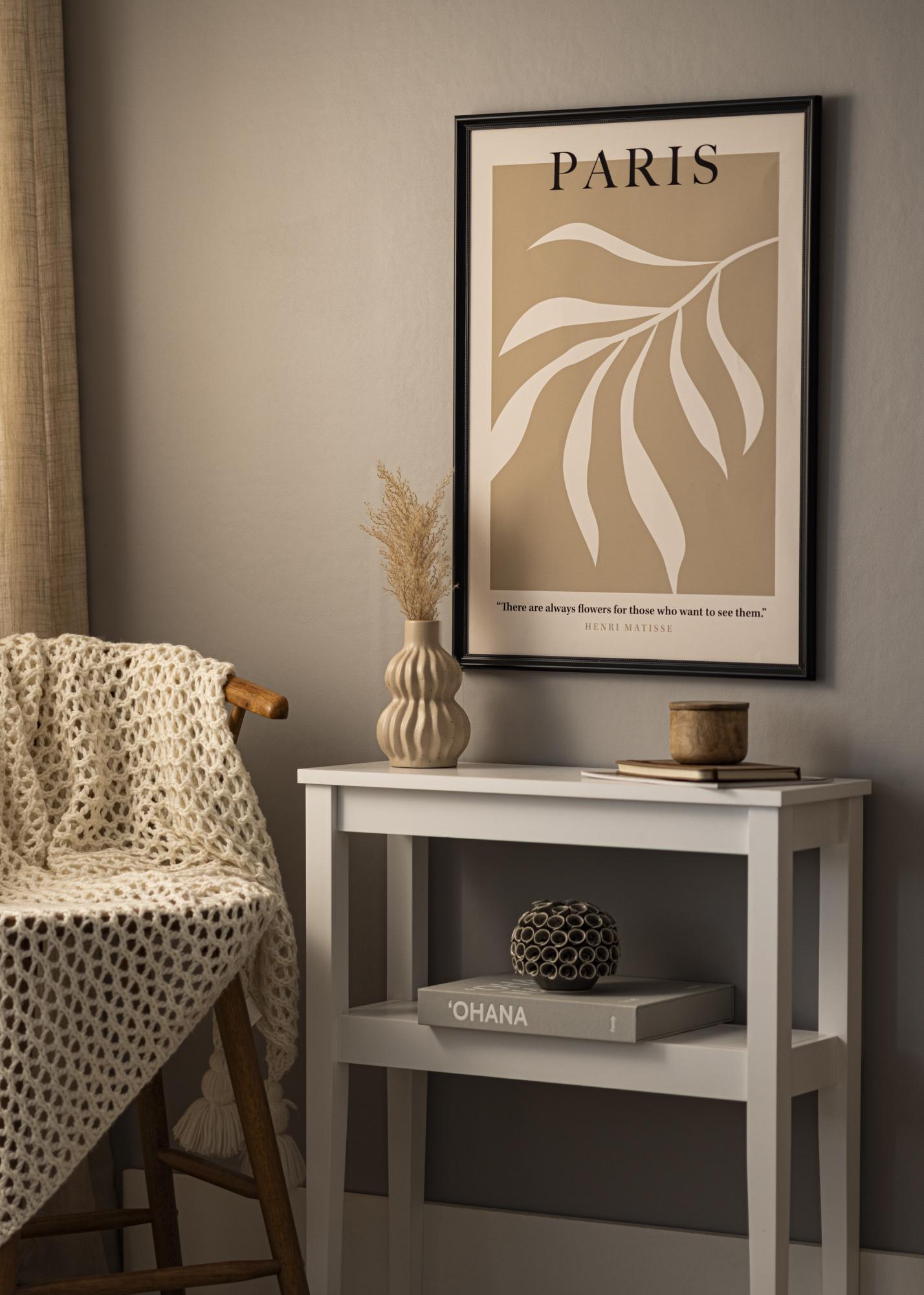 Le cadre a une finition mate et un passepartout blanc. Il est équipé de crochets métalliques pour une suspension horizontale et verticale.