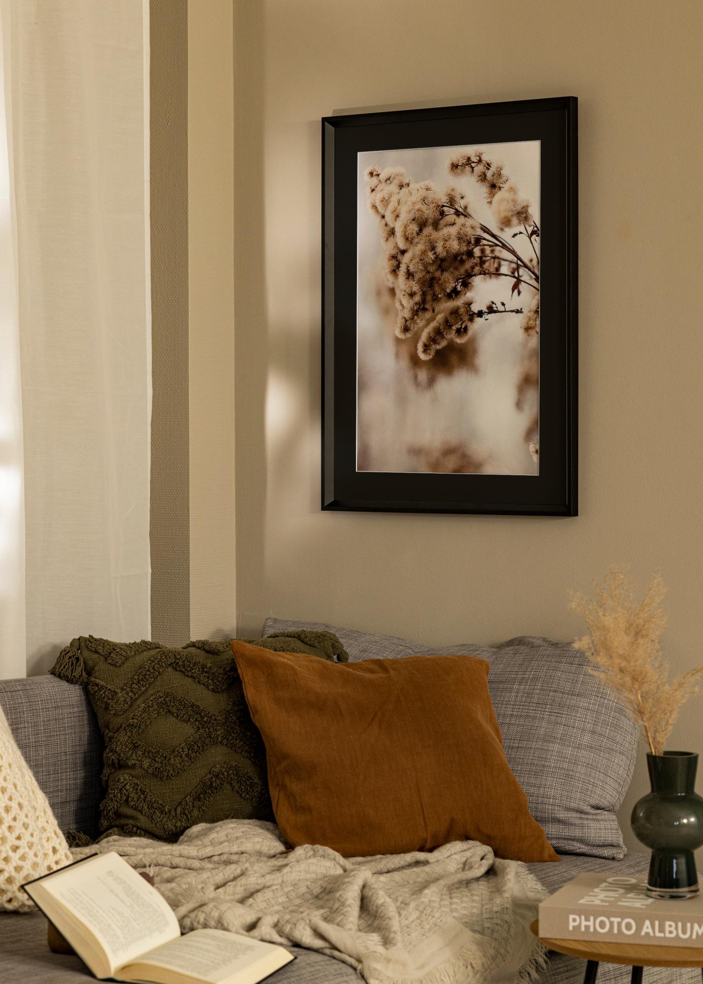 Forfait comprenant un cadre photo et un passe-partout noir inclus. Sur l'image du produit vous pouvez voir les dimensions du cadre (indiquées en gras) et les dimensions intérieures du passe-partout (indiquées entre parenthèses). Veuillez noter que les dimensions intérieures du passe-partout doivent toujours être inférieures de 1 cm à la taille de l'image souhaitée.