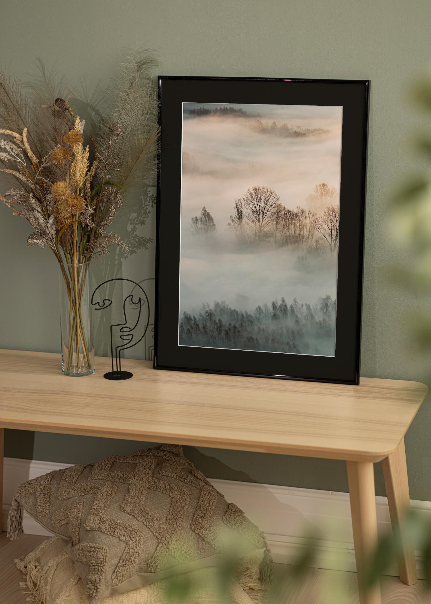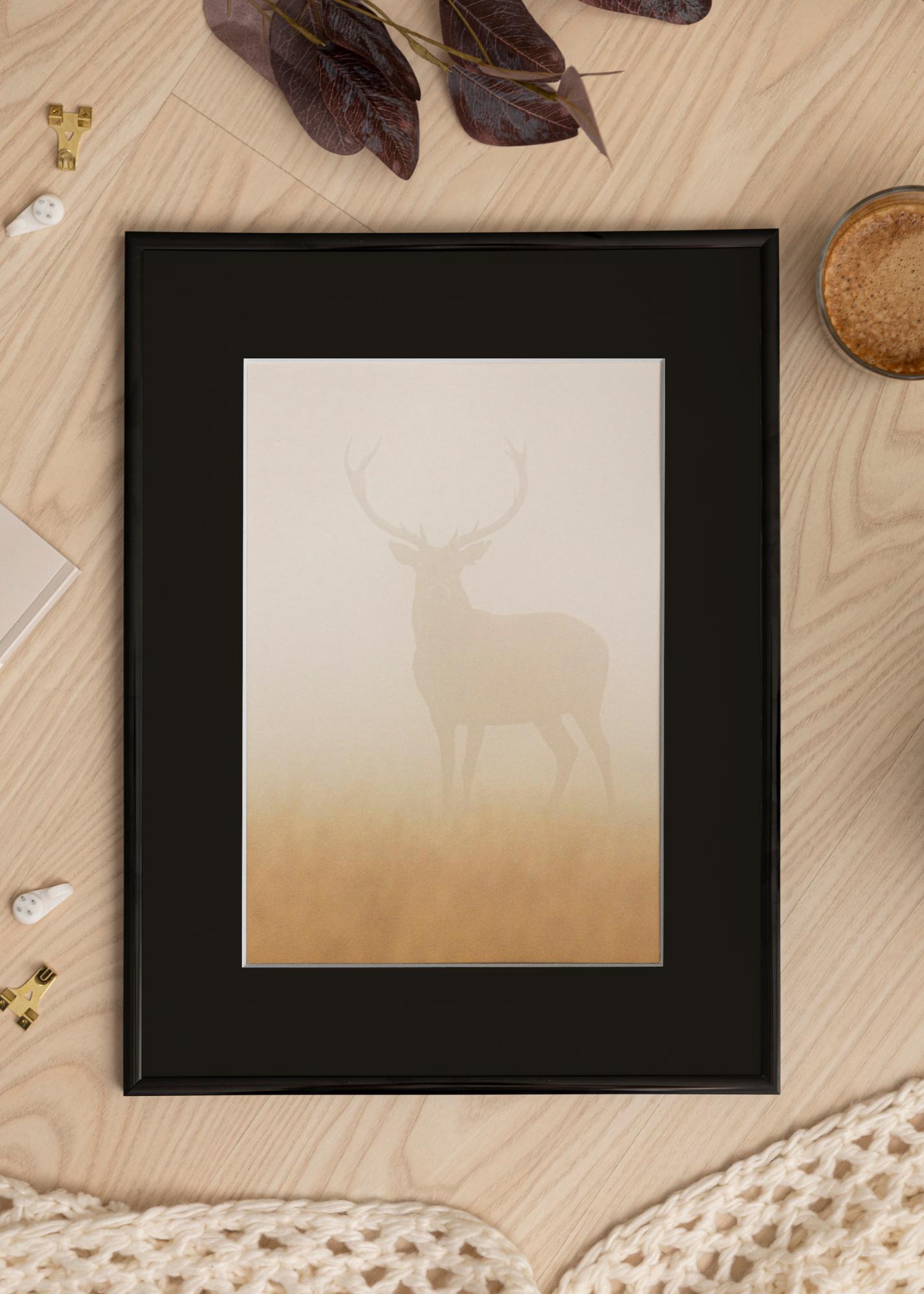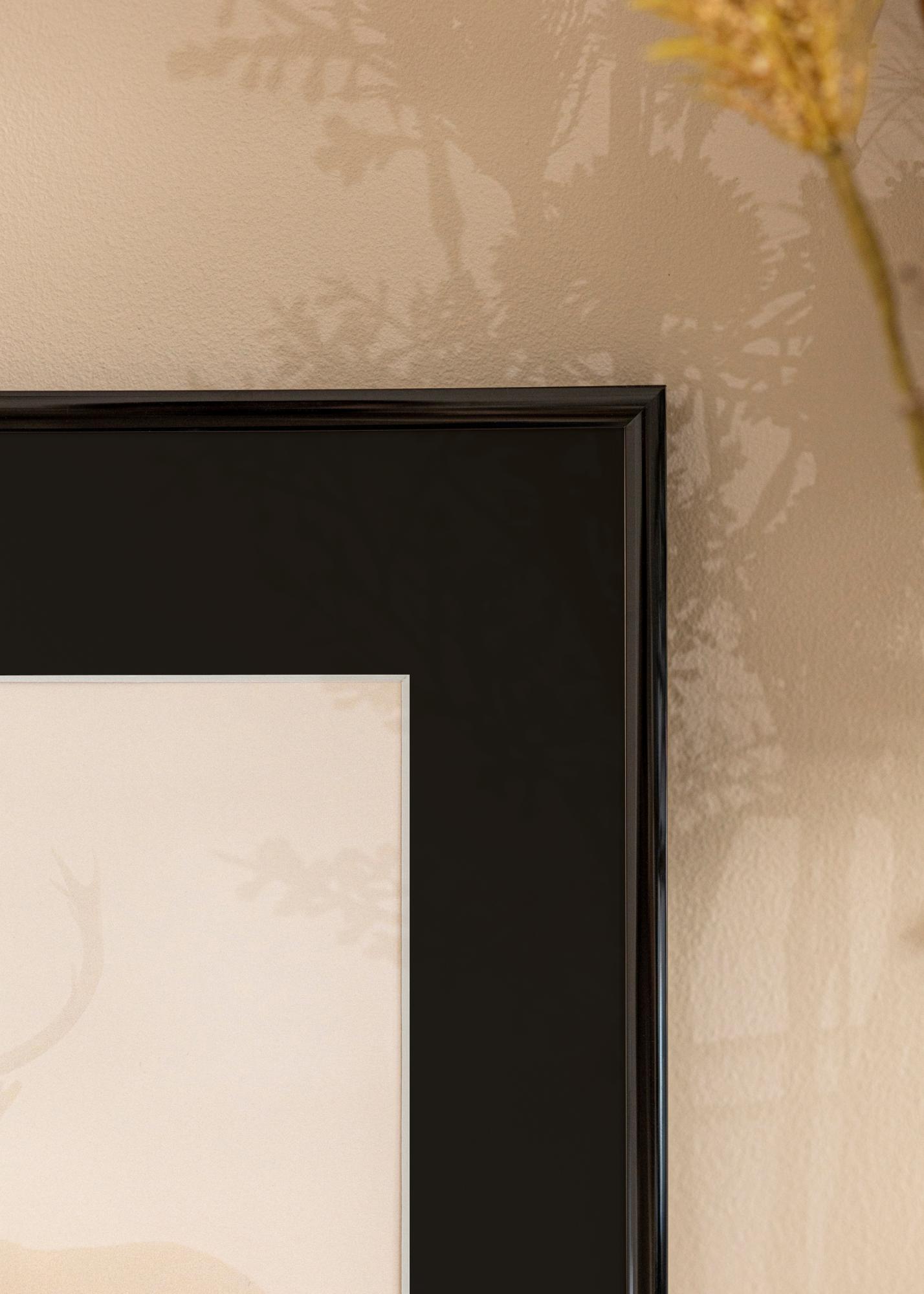 Forfait comprenant un cadre photo et un passe-partout noir inclus. Sur l'image du produit vous pouvez voir les dimensions du cadre (indiquées en gras) et les dimensions intérieures du passe-partout (indiquées entre parenthèses). Veuillez noter que les dimensions intérieures du passe-partout doivent toujours être inférieures de 1 cm à la taille de l'image souhaitée.