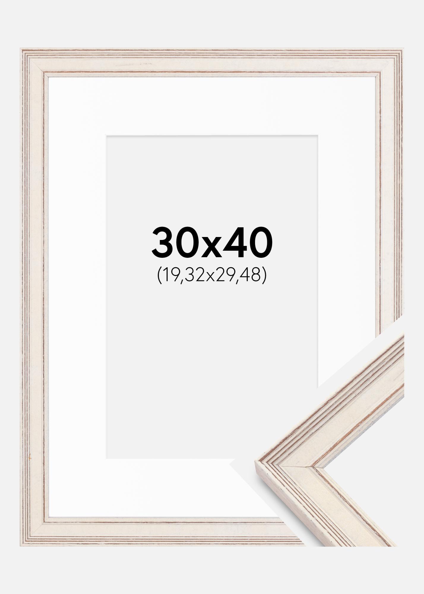 Forfait comprenant le cadre photo et le passe-partout blanc assorti. Sur la photo du produit, vous pouvez voir les dimensions du cadre (indiquées en gras) et les dimensions intérieures du passe-partout (indiquées entre parenthèses). Notez que les dimensions intérieures du passe-partout se doivent d'être toujours 1 cm inférieures par rapport à la taille de l'image que vous souhaitez encadrer.