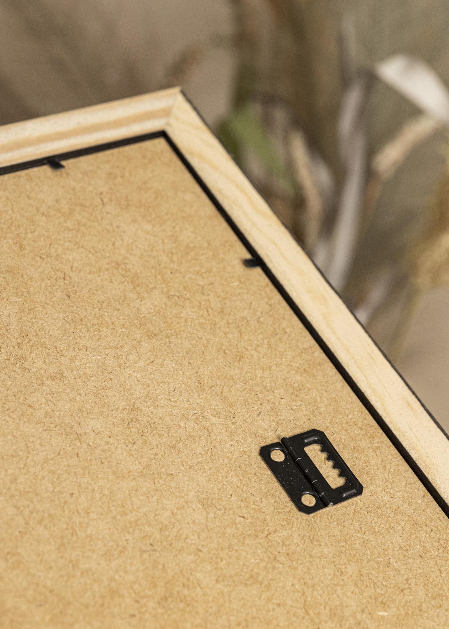 Ce cadre en bois massif est doté de verre acrylique, ce qui comportent plusieurs avantages comme le fait d'être incassable et plus léger. À l'arrière, vous trouverez des supports muraux qui vous permettent de choisir si vous souhaitez accrocher le cadre en mode portrait ou paysage. Le carton de fond est maintenu en place par des clips pliables, grâce auxquels vous pouvez desserrer la plaque arrière pour insérer votre photo dans le cadre.