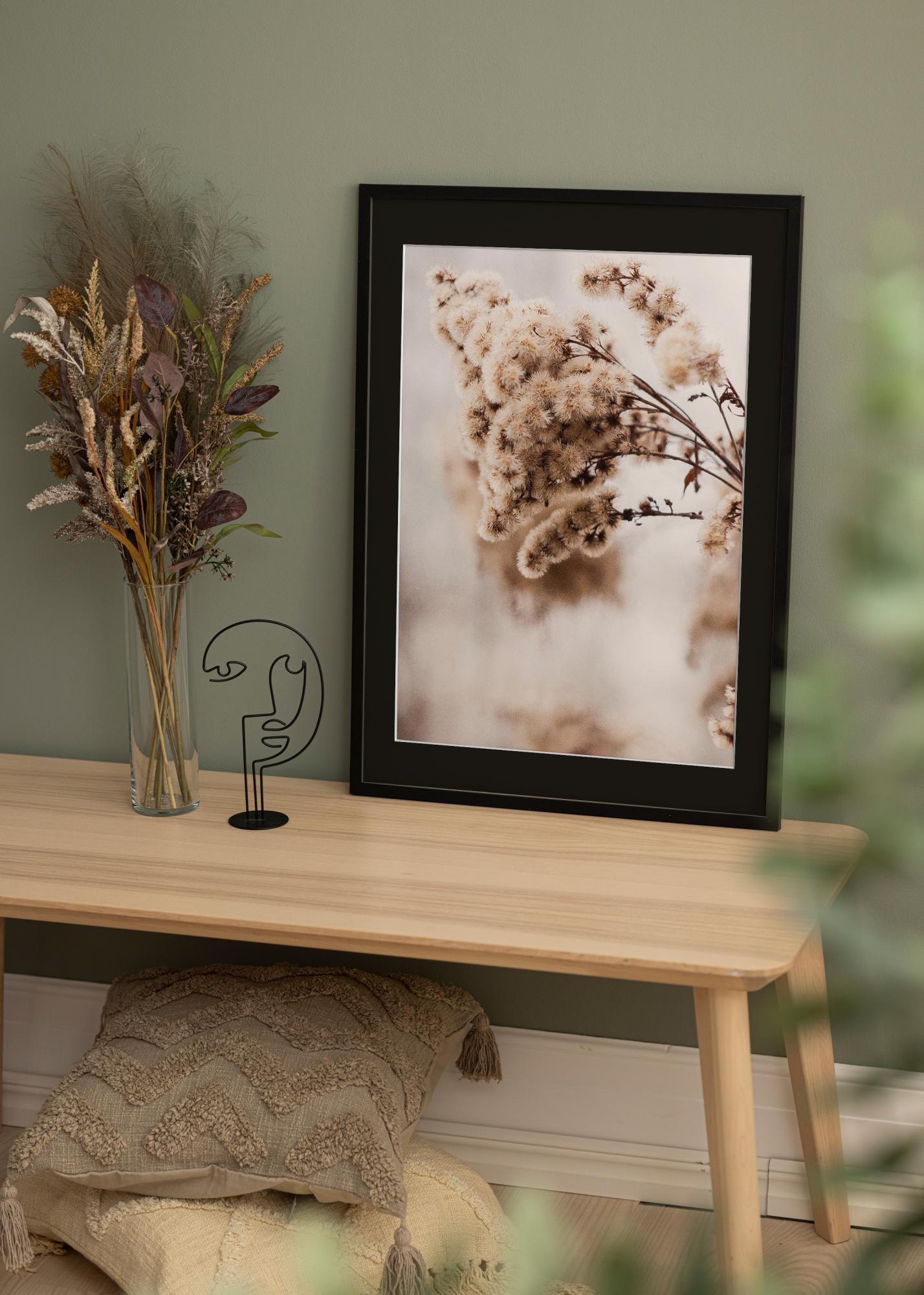 Forfait comprenant un cadre photo et un passe-partout noir inclus. Sur l'image du produit vous pouvez voir les dimensions du cadre (indiquées en gras) et les dimensions intérieures du passe-partout (indiquées entre parenthèses). Veuillez noter que les dimensions intérieures du passe-partout doivent toujours être inférieures de 1 cm à la taille de l'image souhaitée.
