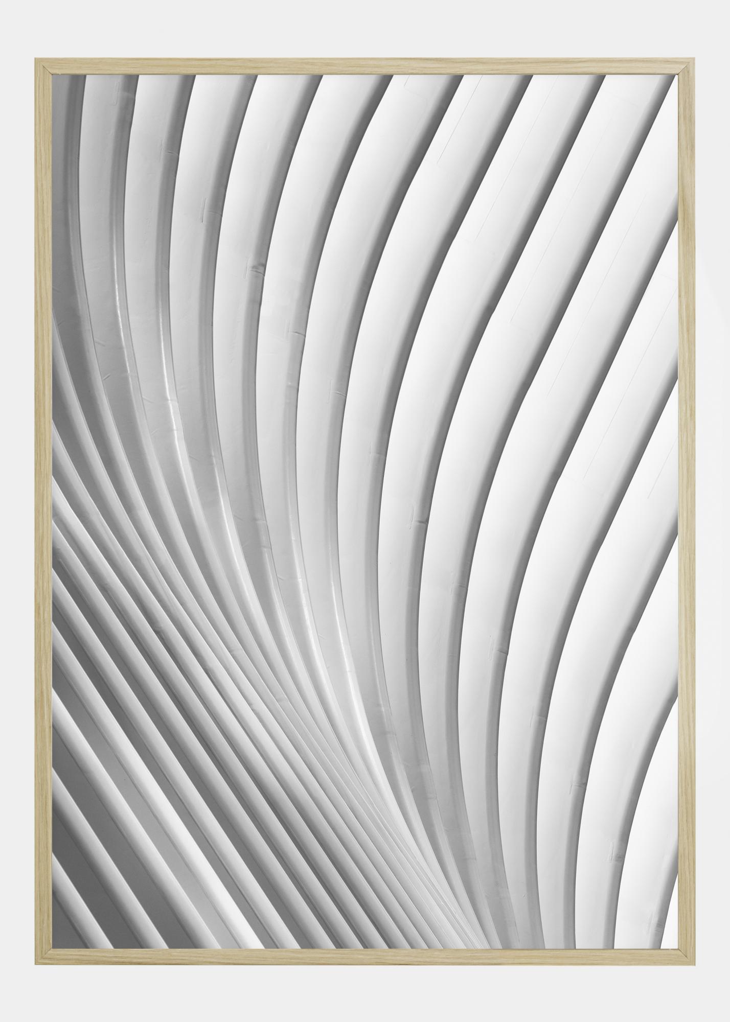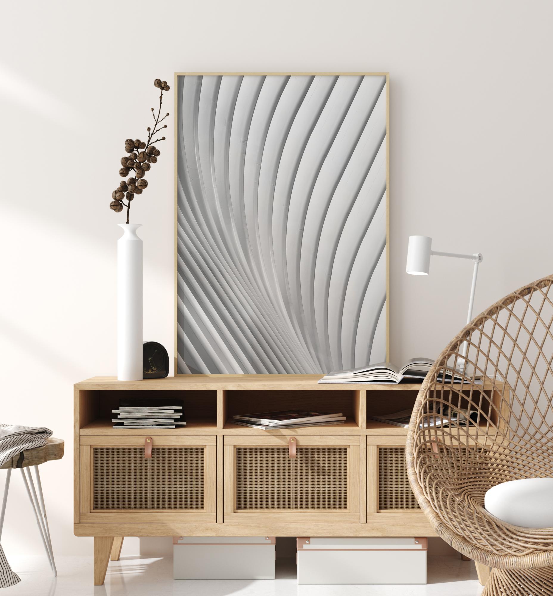Une affiche abstraite de lignes blanches et grises ondulant sur l'image. Les lignes commencent en bas à droite et s'incurvent doucement vers le haut avant de se courber vers le haut. Simple, cette image retient tout de même l'attention lorsque vous laissez vos yeux se détendre et suivre le flux des lignes.