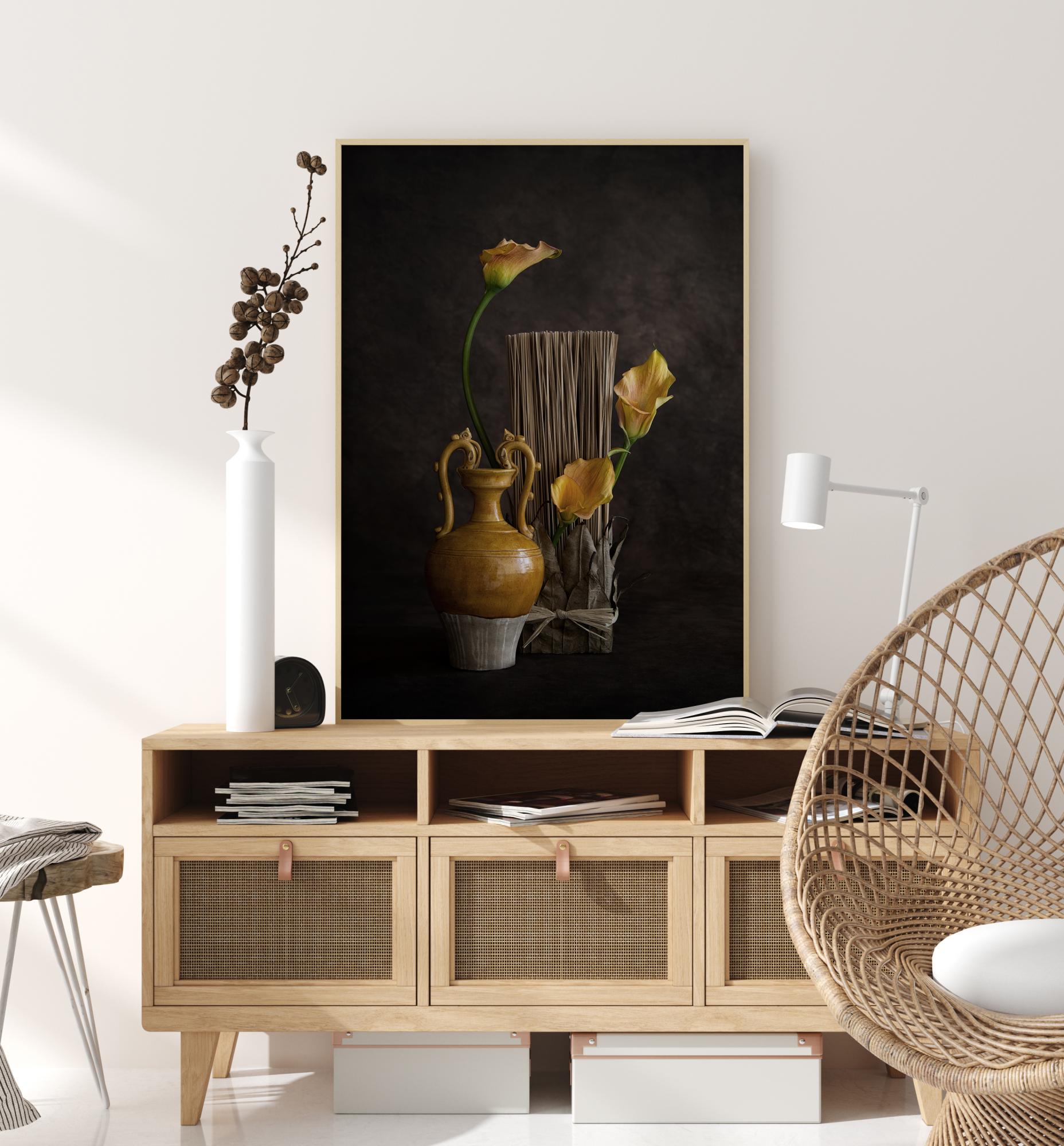 Une affiche de nature morte représentant une cruche, des tiges brunes séchées et trois fleurs de lys Calla. Un fond noir fait ressortir la cruche de couleur moutarde et les trois lys jaunes. L'un des lys se courbe vers le haut, attirant le regard autour de la pièce. Ajoutez cette pièce à votre intérieur pour lui apporter une touche d'élégance.