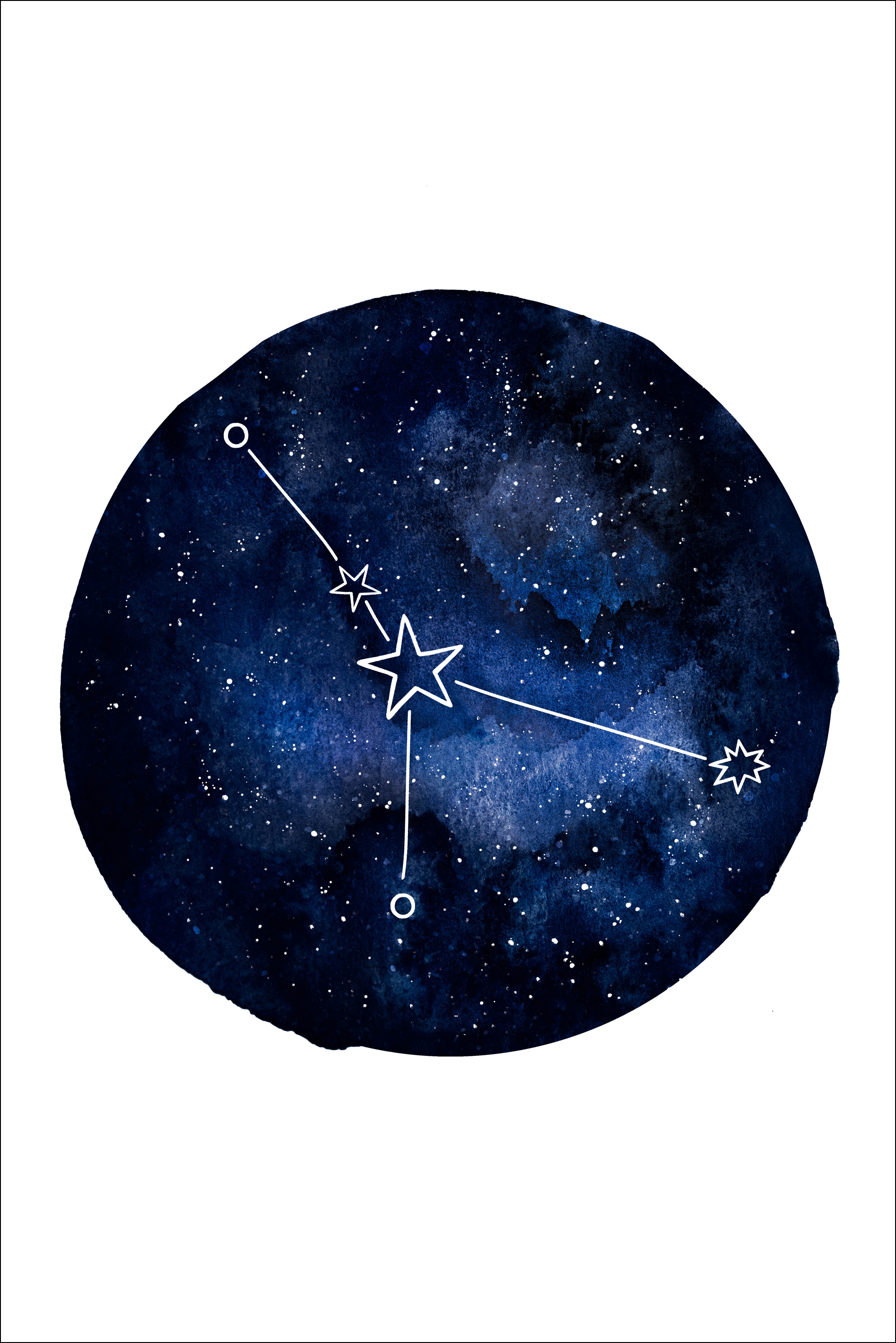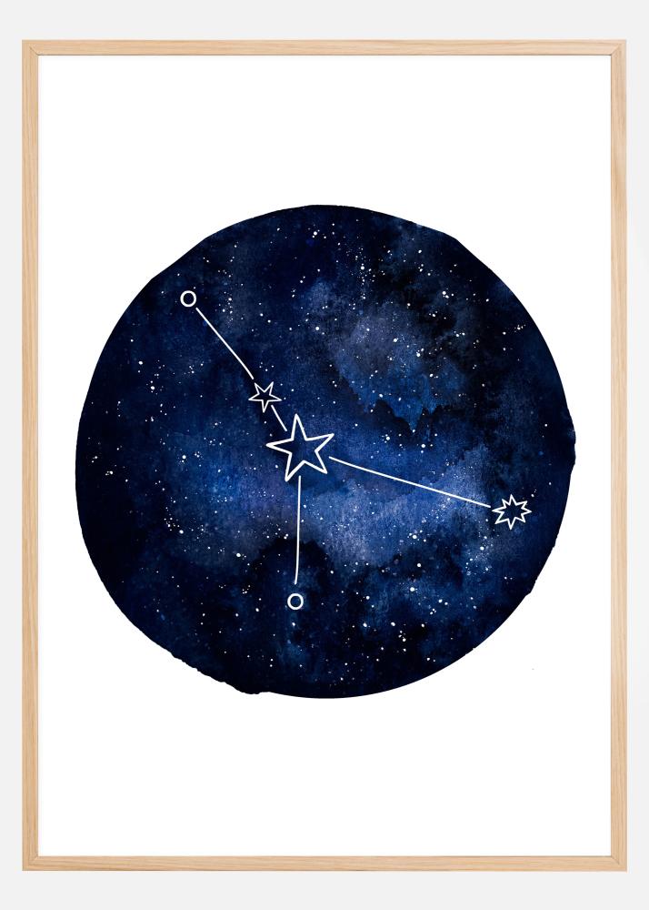 Une affiche horoscope de Cancer. Un cercle bleu foncé remplit le centre de cette image blanche. Dans le cercle se trouvent différentes nuances de bleu ainsi que différentes étoiles. Le signe du zodiaque Cancer est bien visible au centre. Si vous aimez votre signe astrologique, ajoutez cette affiche à votre mur.