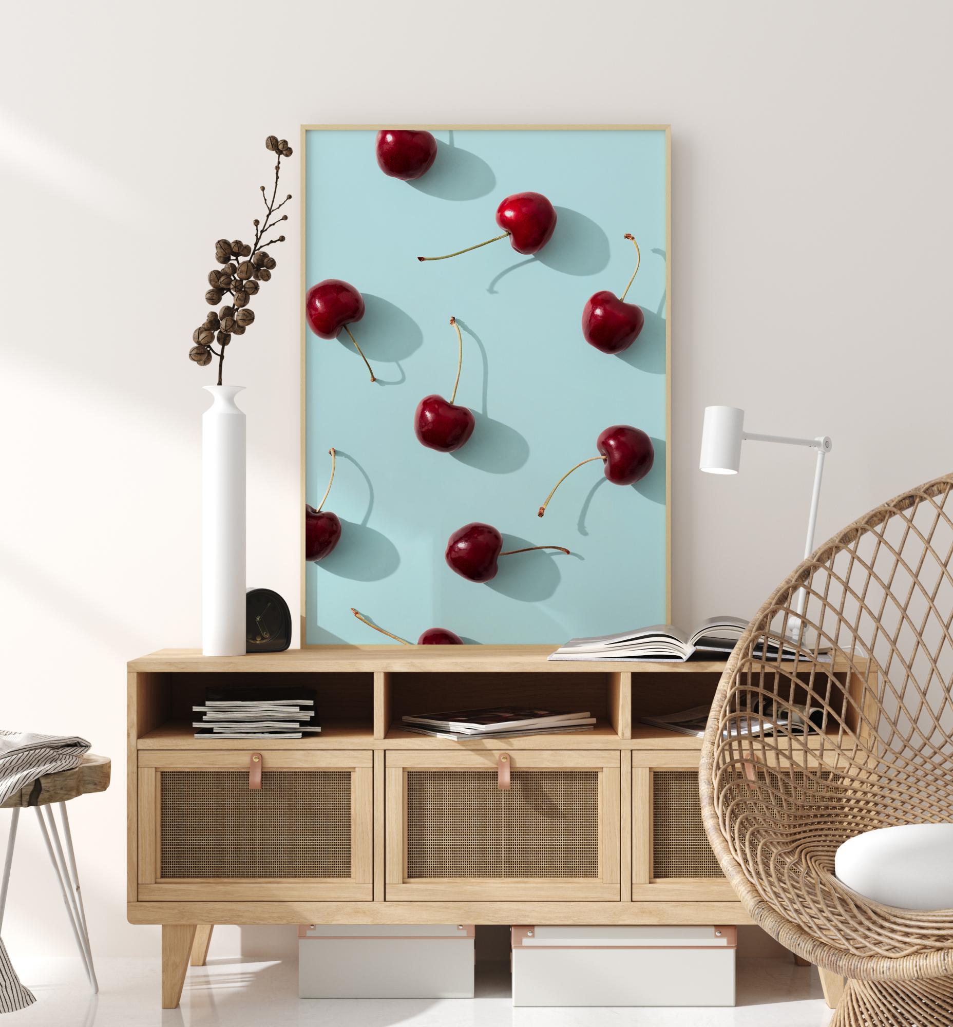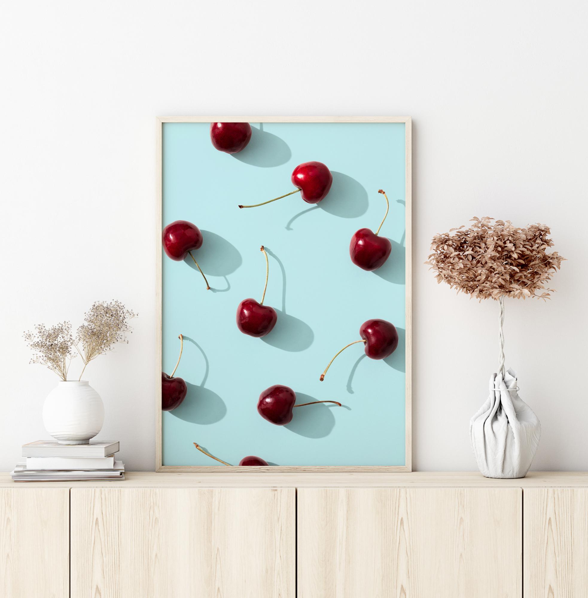 Une affiche de fruits avec huit cerises sur un fond bleu doux. Les cerises rouge vif et leurs pédoncules projettent des ombres sur le simple plateau de table turquoise sur lequel elles reposent. Rappelez-vous que vous devez consommer cinq fruits par jour en accrochant cette image juteuse dans votre cuisine.