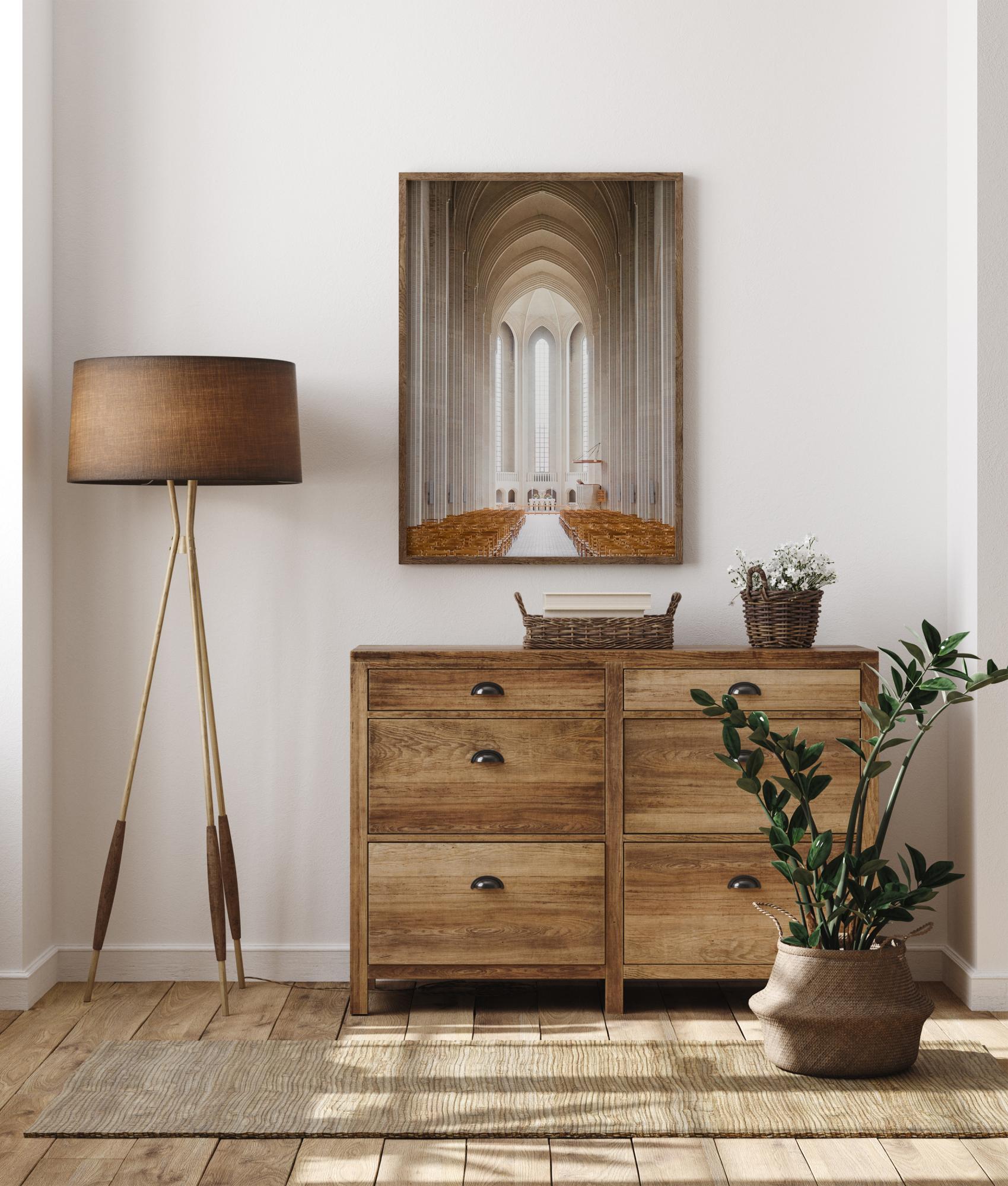 Une affiche romantique d'un intérieur d'église doux. Des chaises marron clair bordent l'allée tandis que de hautes colonnes les encadrent de chaque côté. Les arcs gothiques bordent la pièce, conduisant l'œil vers la lumière blanche brillante au bout de la nef. Rendez-vous à l'église depuis chez vous en accrochant cette affiche religieuse.