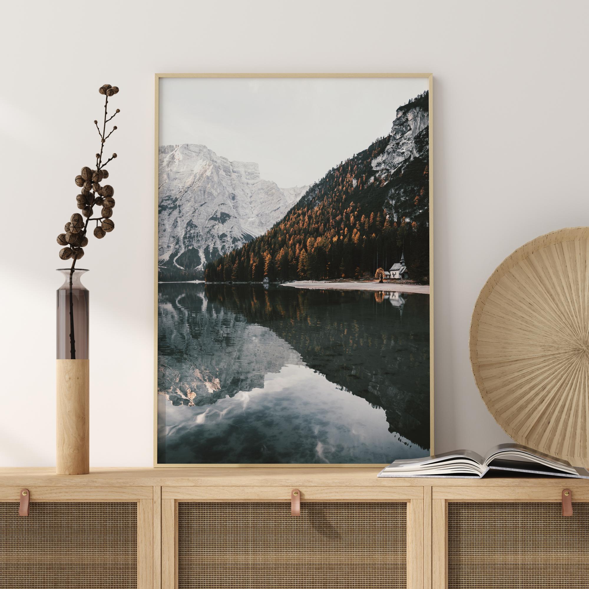 Une affiche épique d'une scène de montagne avec une minuscule église nichée au pied de la forêt. Appréciez la grandeur de ce paysage enneigé où les montagnes se reflètent dans le lac immobile. Des arbres roussâtres bordent le flanc de la montagne et une petite église blanche se trouve à sa base. Laissez-vous inspirer en regardant les merveilles de la nature.