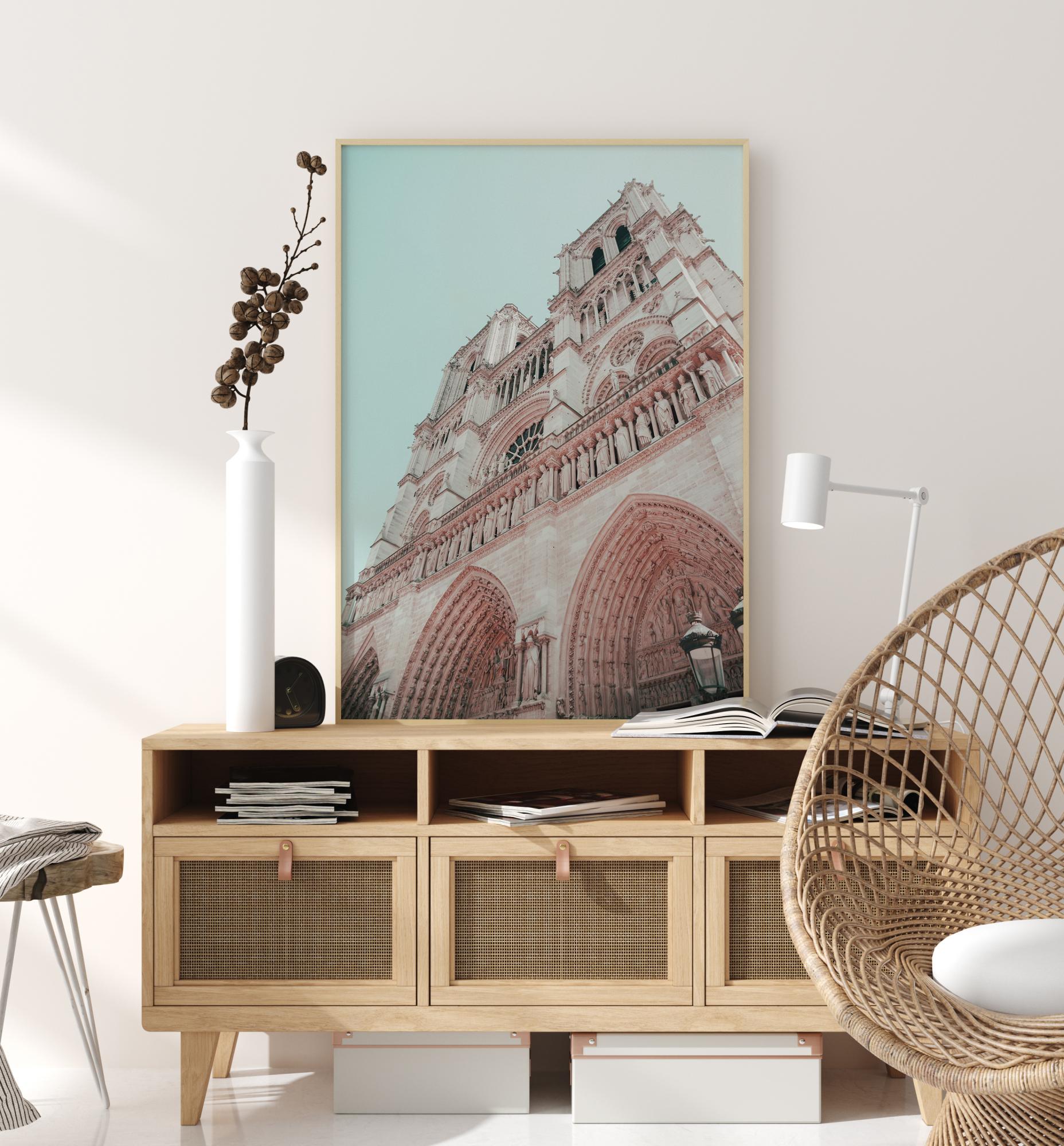 Une affiche spectaculaire de la façade d'une église. Admirez ce bâtiment blanc et rose avec ses arcs gothiques, ses statues de saint en pierre et ses fenêtres rondes. Les doux pastels créent un sentiment d'harmonie, le moyen idéal de s’offrir une ambiance apaisante chez soi.