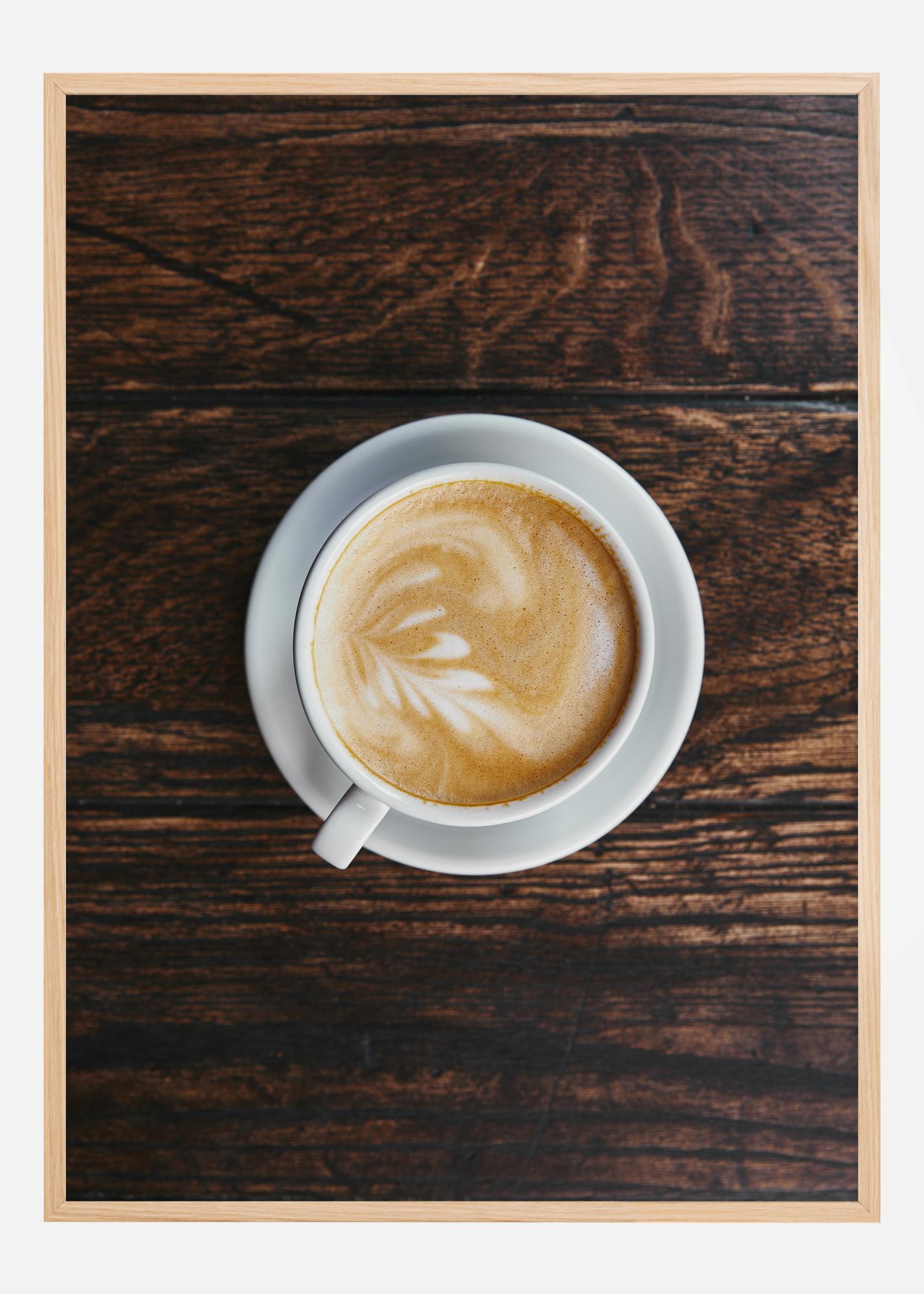 Cette affiche accueillante et réchauffante est un hommage à la culture du café et parfaite pour tout amateur de café. Une vue de dessus d'une tasse de café blanche classique sur une surface en bois brun foncé transmet une sensation immédiate de confort et de pause dans le quotidien. La mousse sur le café présente un motif artistique élégant, invitant à un moment de détente et de plaisir.