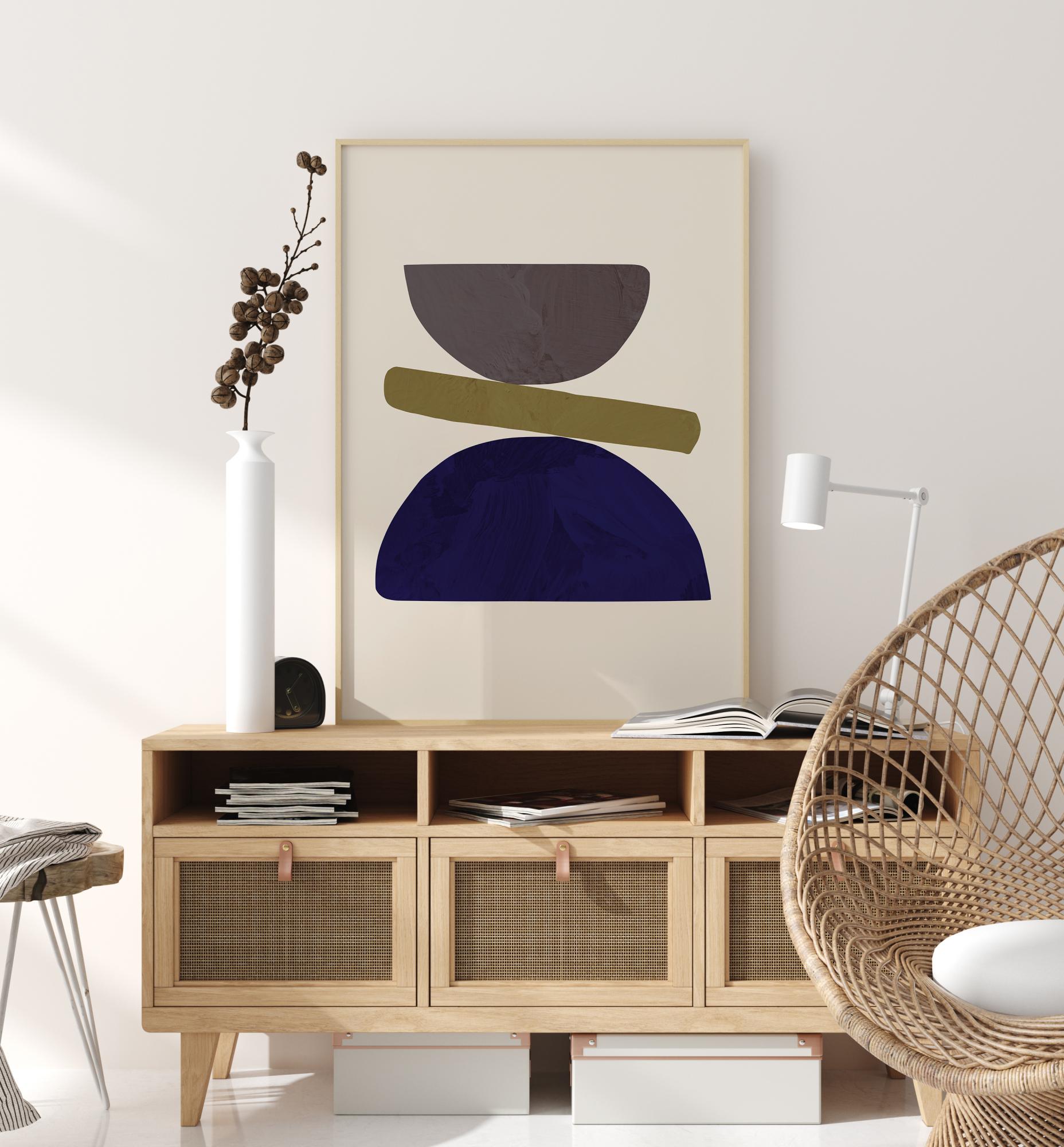 Une affiche lumineuse avec trois formes bleu foncé et noires créant une image fascinante. Un demi-cercle se trouve en bas, en équilibre avec un autre demi-cercle tourné vers le haut. Un cercle noir flotte au-dessus, le tout sur un fond blanc saisissant. Assortissez les magnifiques tourbillons de marbre avec un mur au ton plus pâle. Effet garanti !