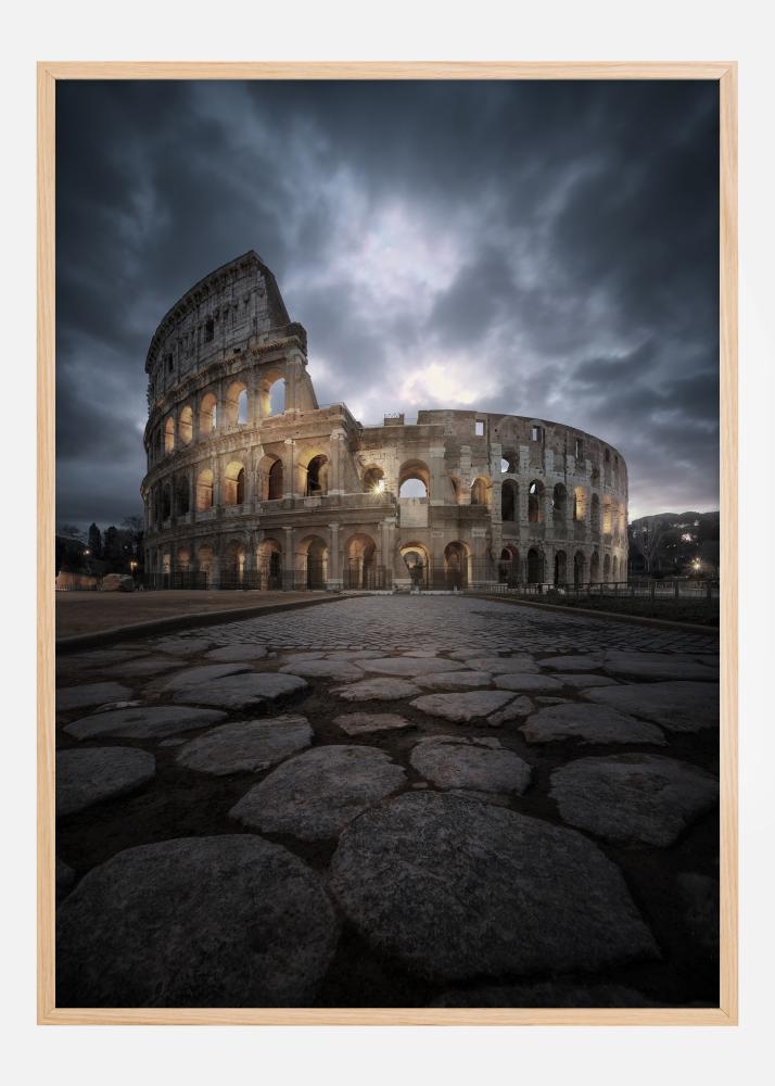 Cette affiche dramatique capture l'essence des ailes de l'histoire avec une image impressionnante du Colisée à Rome sous un ciel intensément nuageux. Les tons profonds de gris et de bleu du ciel contrastent fortement avec l'éclairage chaleureux qui met en valeur la texture des pierres antiques. Cette impression offre un aperçu de l'architecture et du design anciens, arrêtant le temps grâce à sa beauté intemporelle.