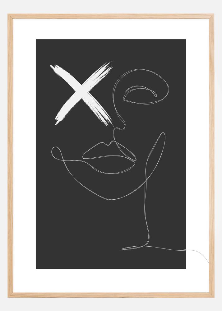 Une affiche abstraite d'un visage dessiné avec une fine ligne noire sur un fond blanc brillant. La ligne est jointe en un seul mouvement fluide pour dessiner le visage. Au-dessus d'un œil se trouve une grande croix noire. Accrochez cette affiche sur un mur coloré pour en faire le sujet de conversation de votre maison.