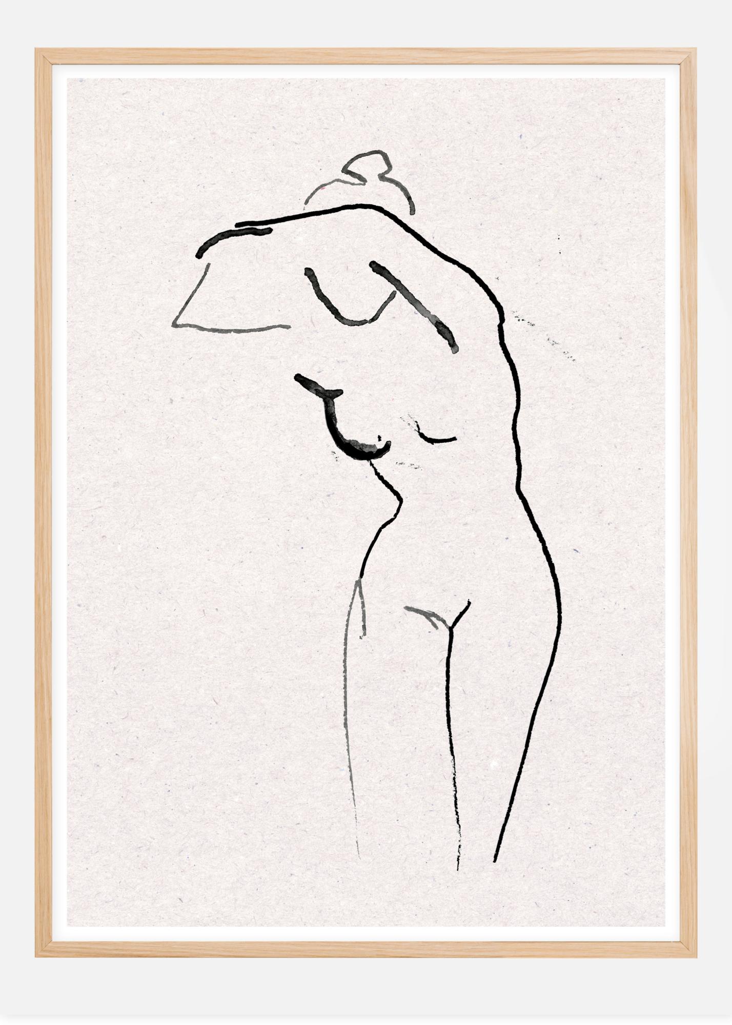 Un poster d'art graphique en aquarelle créé par Cora Art et Illustration. Ici, une femme prend forme en fines lignes noires sur un fond gris clair. Le motif délicat est ensuite entouré d'un passe-partout blanc un peu plus étroit.