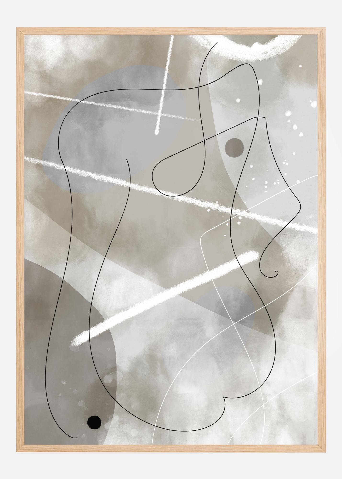 Une affiche abstraite d'un visage fait de lignes délicates. Derrière les lignes fines qui forment le visage se trouve un fond bleu et gris nuageux. D'autres lignes et formes abstraites flottent dans l'air, rendant cette œuvre plus complexe. Faites le puzzle de cette image dans le confort de votre maison.