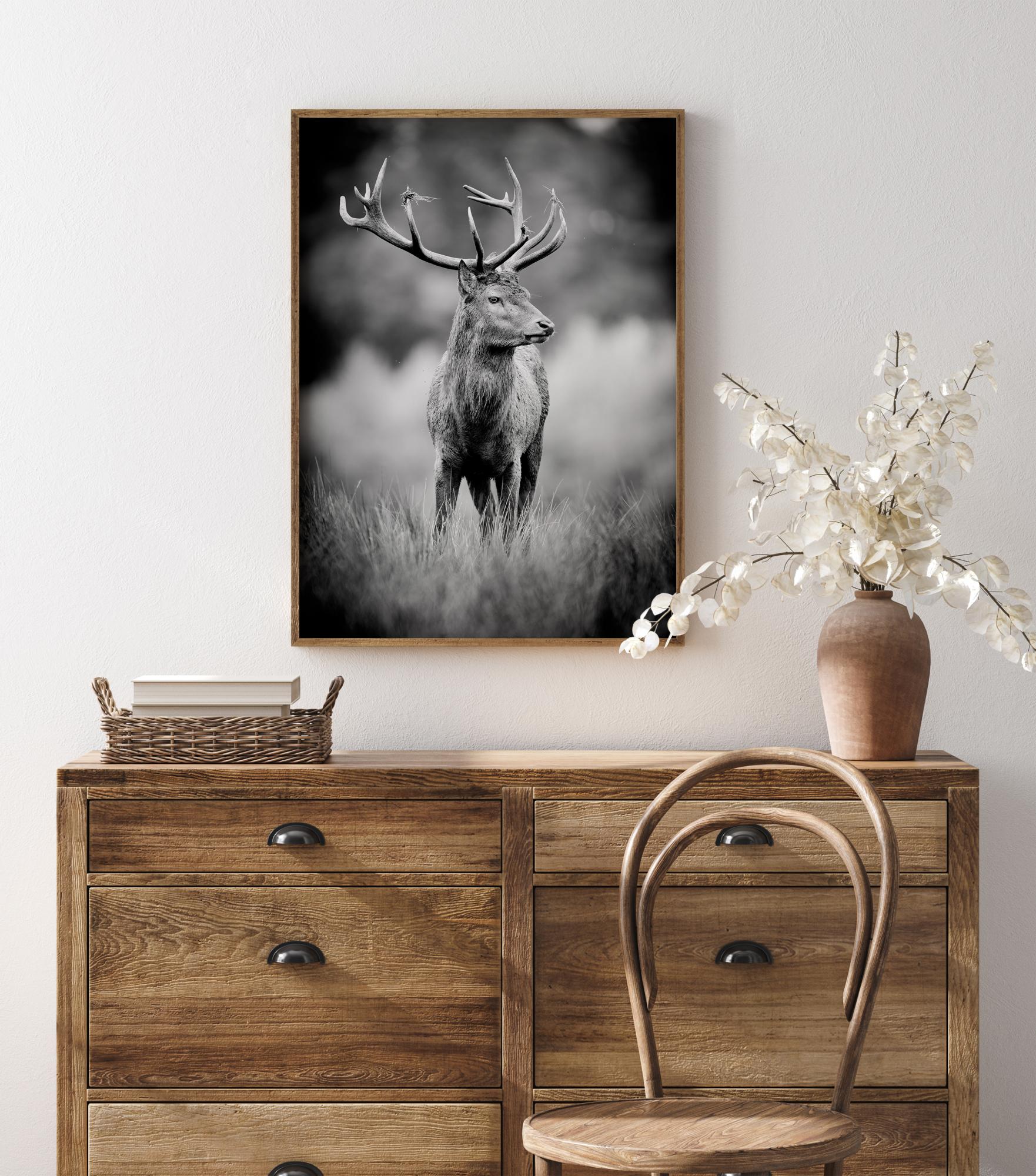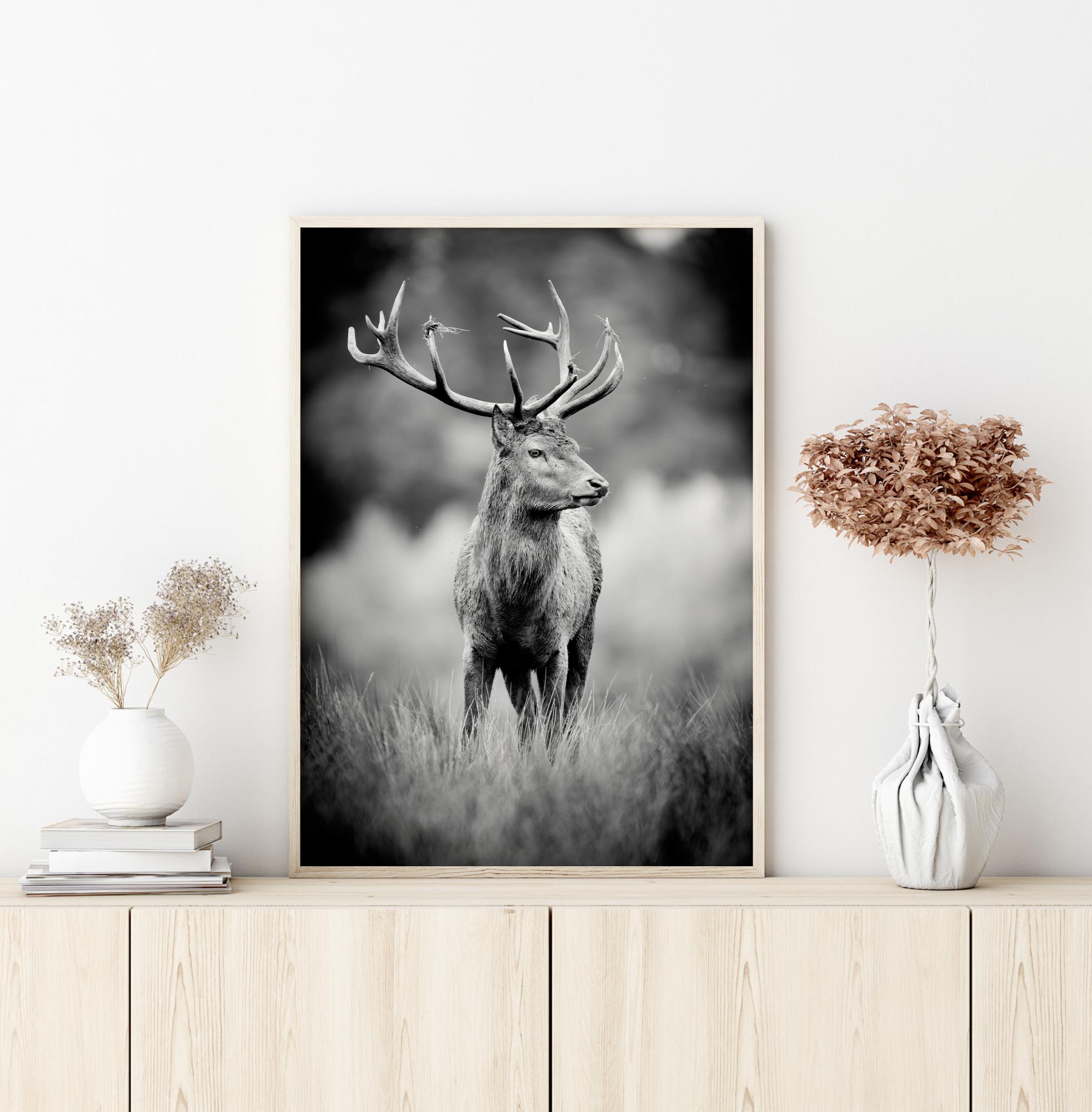 Affiche animalière d'un cerf avec ses bois en noir et blanc. La vignette donne l'impression que vous l'observez de loin avec des jumelles, comme vous le feriez dans la nature, ce qui rend cette scène encore plus spéciale. Sa tête tournée signifie qu'il regarde en arrière et vous attire.
