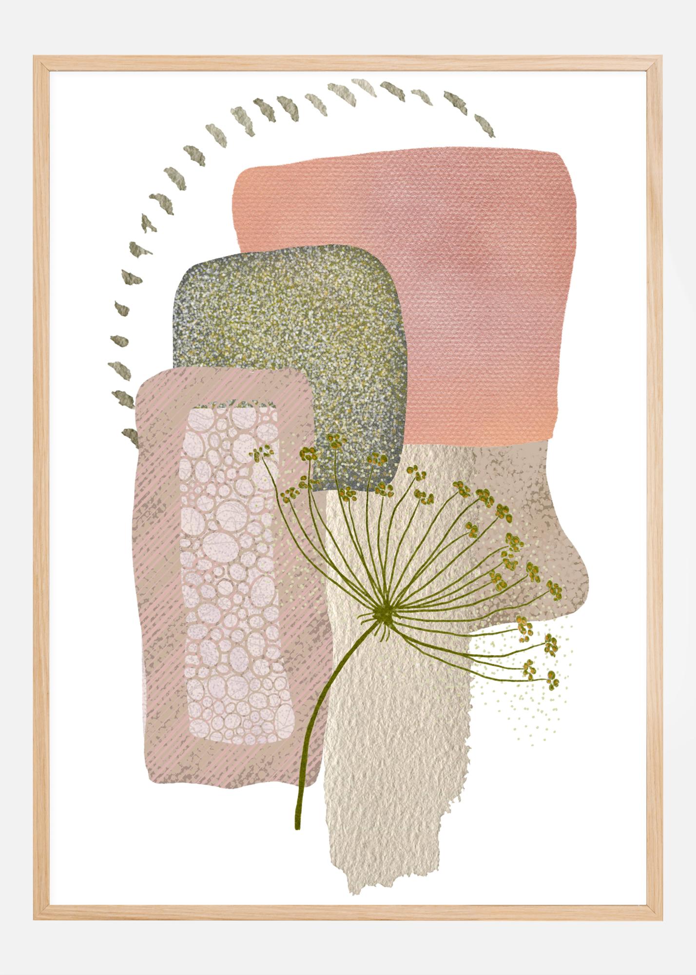 Cette affiche dégage une sensation de calme et de beauté grâce à sa combinaison décontractée de tons doux et de formes abstraites. Au centre de la composition se trouve une tige de fleur délicate qui s'élève, avec ses petits boutons verts éclairés par une tige fine et gracieuse. Les superpositions de texture et de couleur créent une profondeur et un intérêt qui captent l'œil et invitent à une contemplation prolongée. Avec sa palette apaisante de rose et de vert, cette impression artistique transmet un sentiment de tranquillité et de simplicité de la nature, faisant d'elle un bel ajout à chaque foyer.