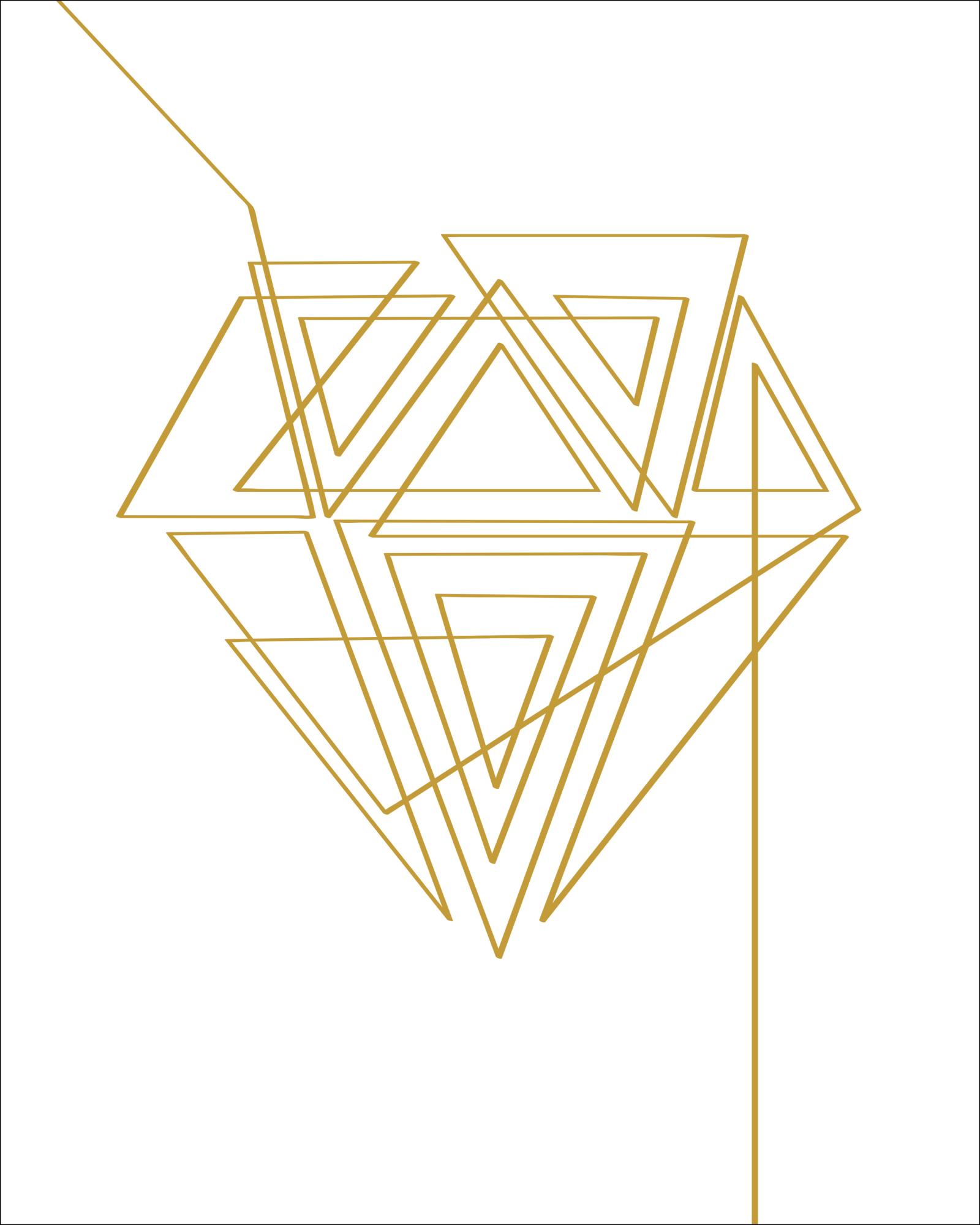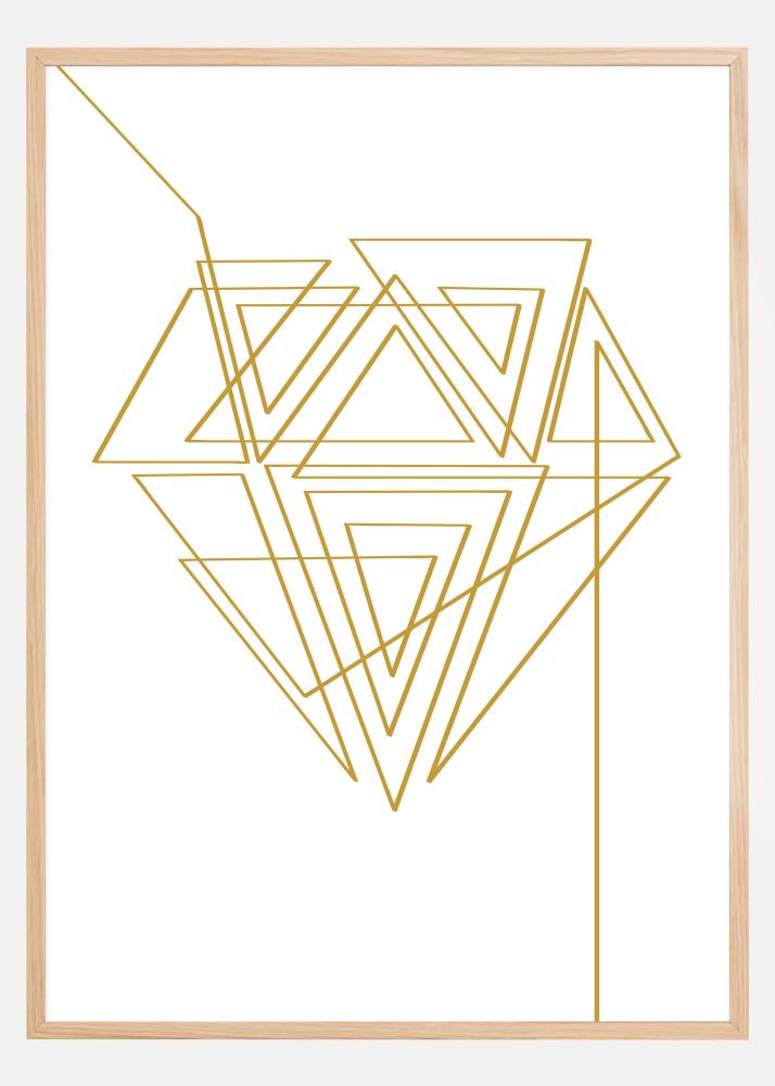 Un poster abstrait d'un diamant composé de lignes géométriques dorées. Ce diamant est astucieusement créé à partir de diverses formes triangulaires, mais le tout en une longue ligne ininterrompue. Suivez la ligne et voyez si vous pouvez démêler le motif complet. Cette affiche sur fond blanc est idéale sur un mur crème ou doré.