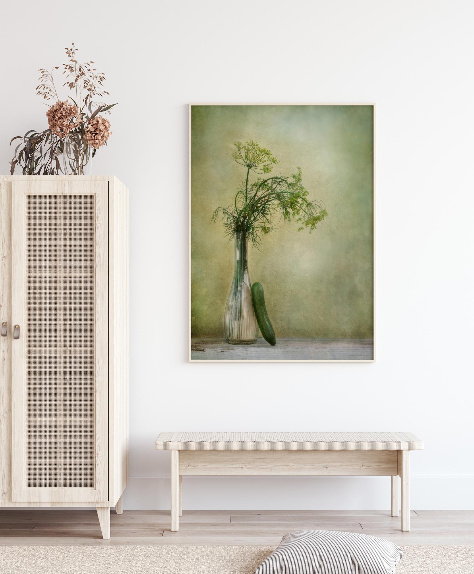 Une affiche de légumes représentant de l'aneth et un concombre sur un mur vert et jaune. Le vase en verre contient les brins d'aneth tandis que le concombre s'y appuie dans cette nature morte. Les tons doux, style aquarelle, en arrière-plan sont plus clairs autour des feuilles et plus foncés vers les bords. Suspendez cette image dans une cuisine pour donner une touche végétarienne à votre déco.