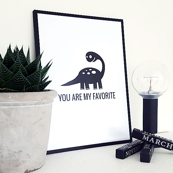 Adorable print avec un mignon dinosaure à offrir à son favori absolu dans le monde. Décorez la chambre d'enfant avec une feuille graphique qui fait sentir l'enfant aimé, spécialement conçu pour tous les fans de dinos. La typographie noire élégante assure que le print s'intègre quelles que soient la couleur et le style de la pièce. Se marie bien avec Elefant Dream, Kanin Happy, Hund Little, Superhero ou Pingvin Cool.