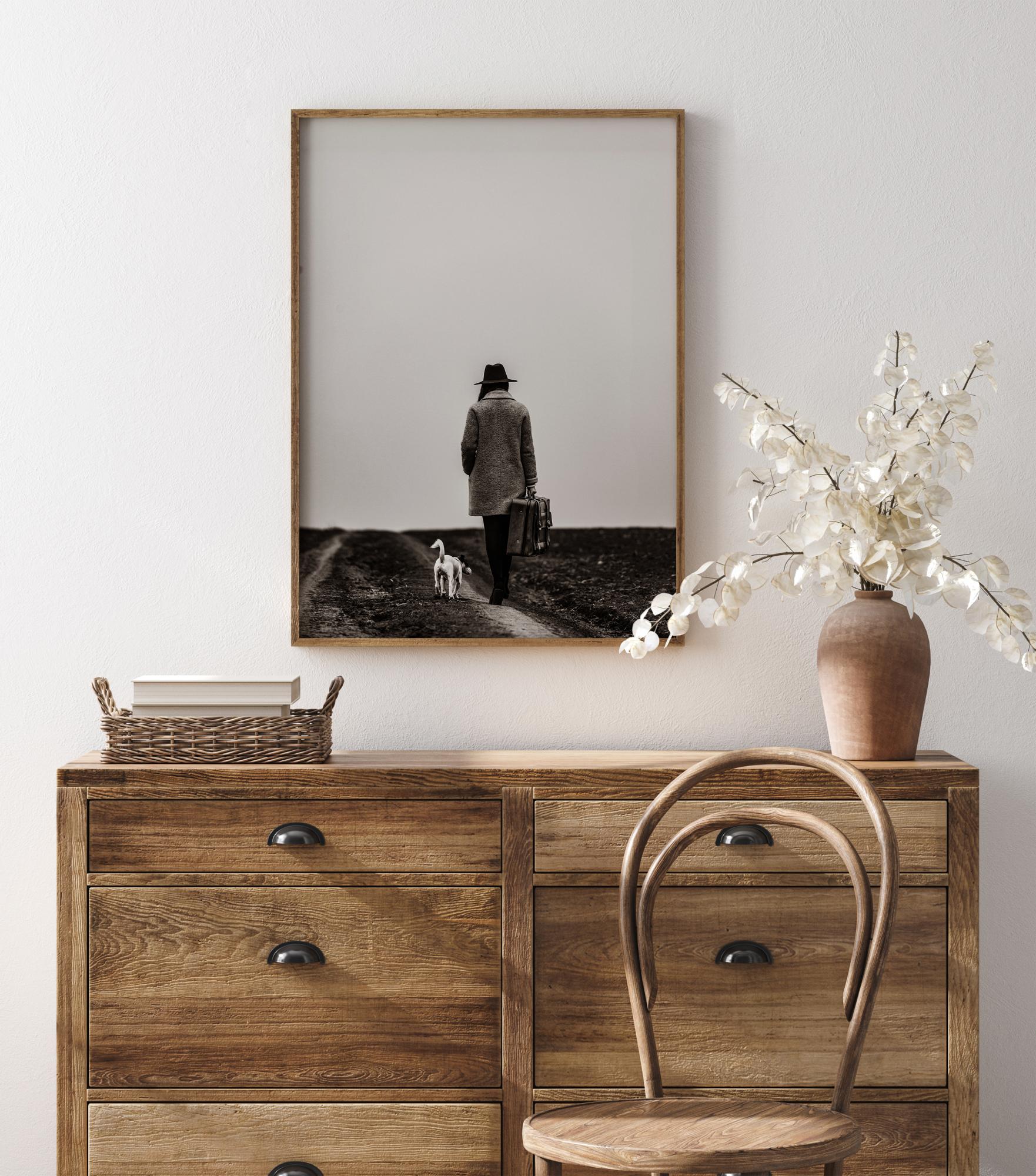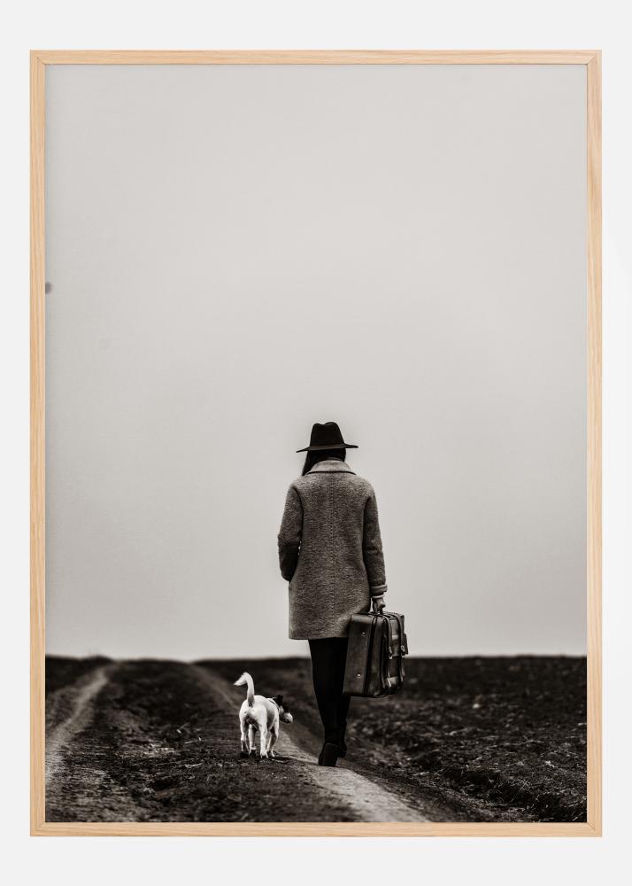 Une affiche minimaliste d'une femme marchant le long d'un chemin avec son chien. Le chemin à deux voies s'éloigne tandis que la femme vétu d’une longue veste porte une valise. Le grand ciel blanc nous invite. Rejoignez cette femme dans ses voyages en ajoutant cette image en noir et blanc à votre mur.