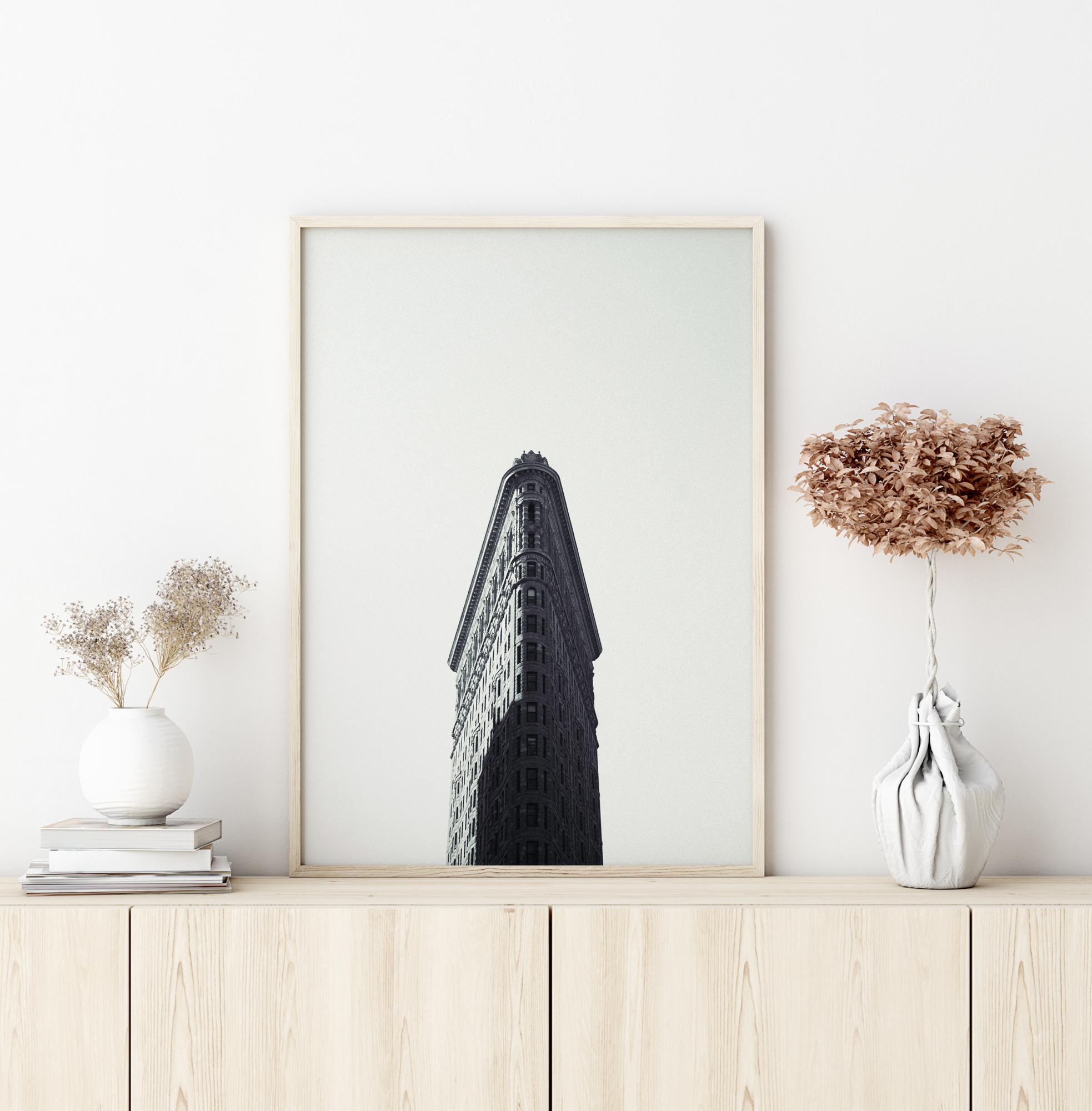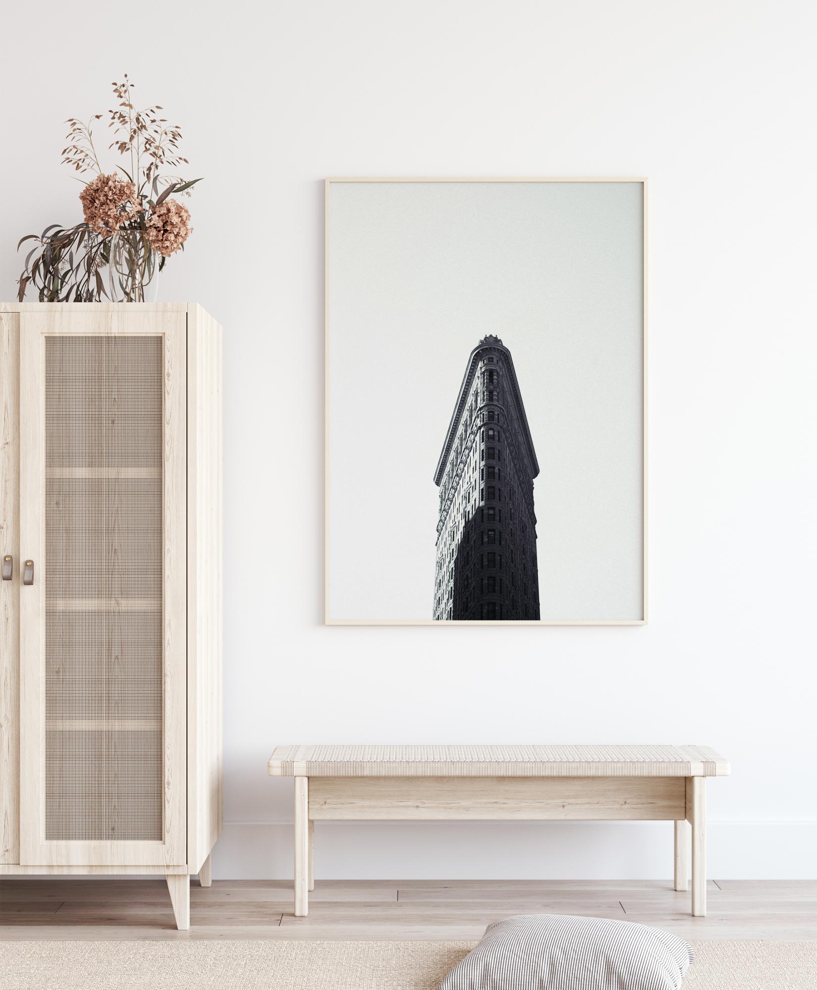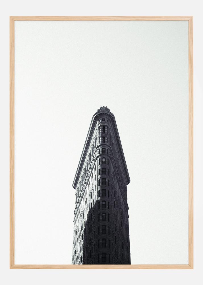 Une affiche d'architecture représentant l'angle avant d'un immeuble ancien. L'avant du bâtiment ressemble à la proue d'un bateau qui se détache fortement du ciel blanc. La forme triangulaire attire le regard vers l'intérieur et vers le haut du bâtiment. Ajoutez cette image à un mur de couleurs vives pour créer une ambiance artistique.