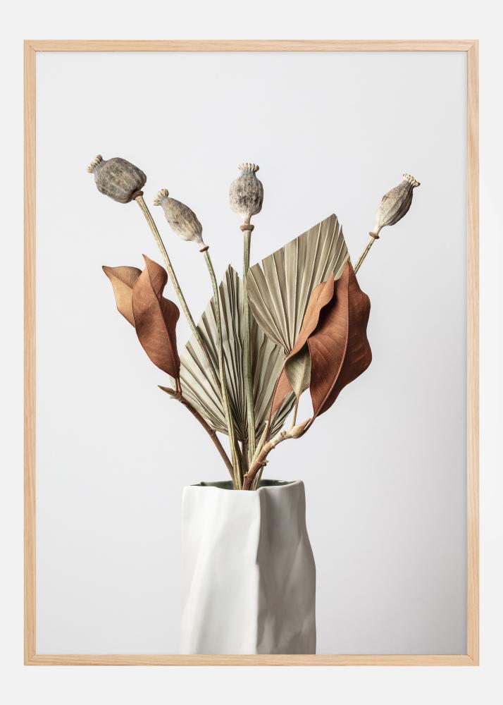 Ce poster sophistiqué montre une composition élégante de plantes séchées et de capsules de graines qui s'élèvent d'un vase blanc épuré. L'arrangement est un hommage à la beauté statique du monde végétal, avec des nuances variées allant du gris et du brun aux tons rouille profonds et verdâtres. Cette impression capture le moment de quiétude où chaque forme et texture unique des plantes est éternellement préservée sous forme d'art.
