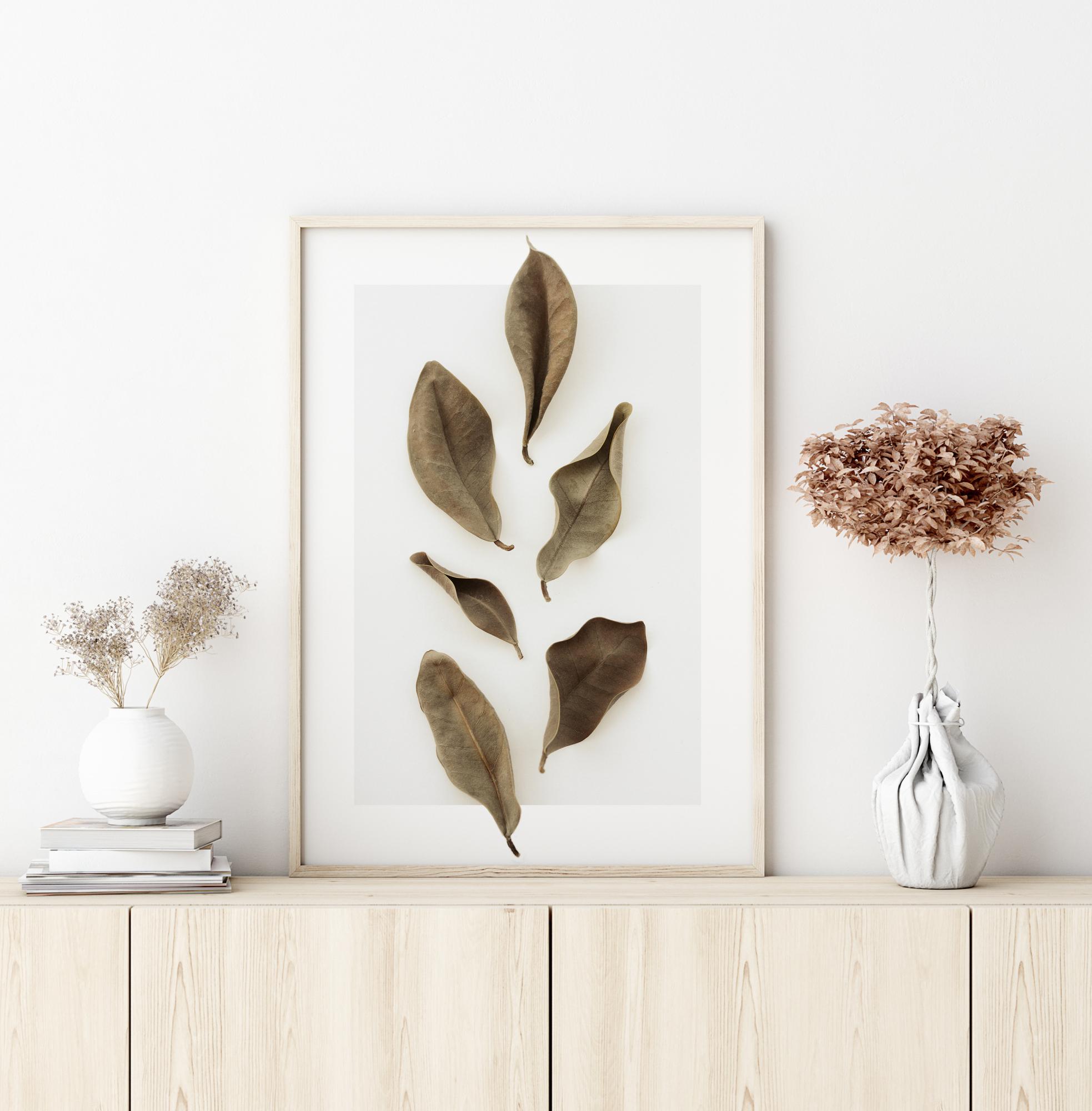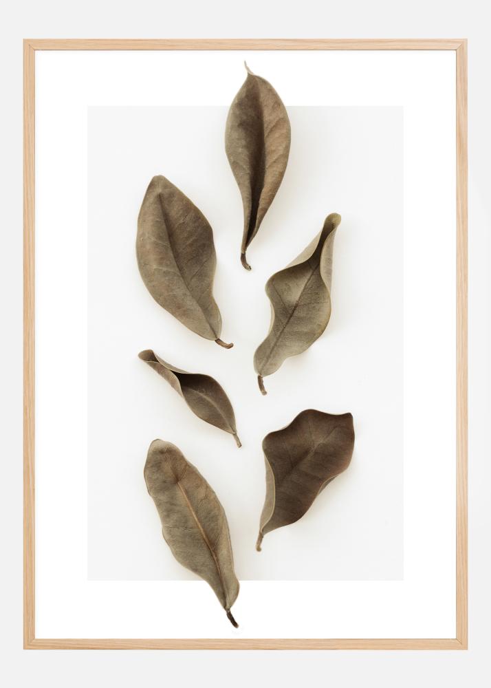 Une affiche détaillée de quelques feuilles séchées. Six feuilles séchées sont disposées comme si elles étaient encore attachées à une branche sur un fond blanc. Les feuilles brunes sont simples et unies, parfaites pour mettre en valeur un mur chargé ou ajouter un motif à un mur monochrome.