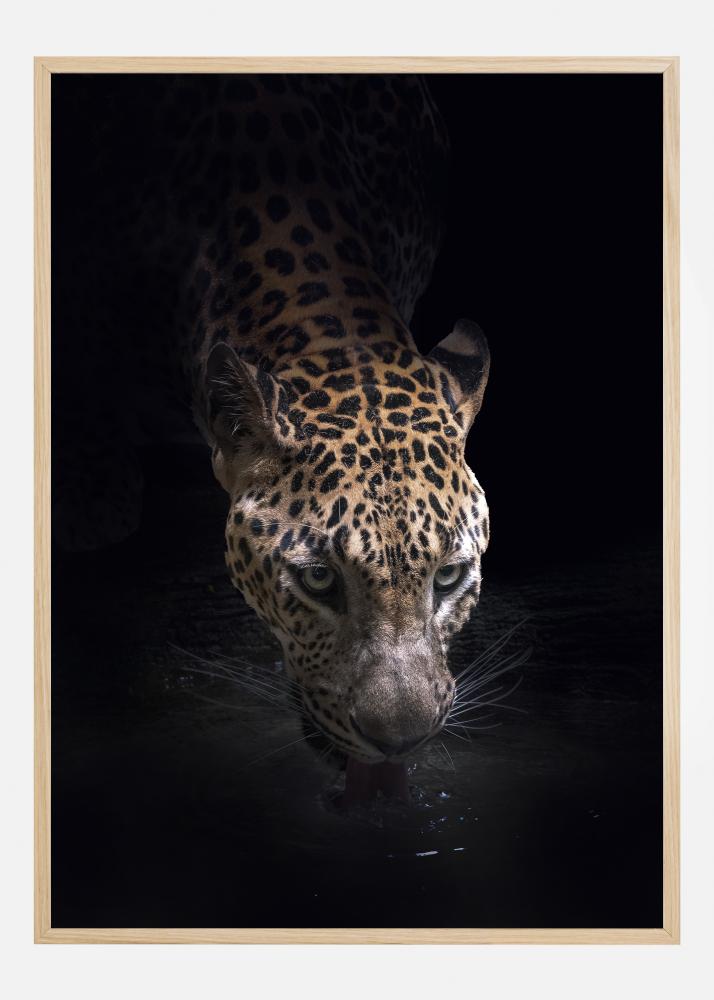 Ce poster dramatique capture un léopard dans un moment intime alors qu'il boit tranquillement de l'eau, un puissant instant de nature sauvage emprisonné dans le temps. Le fond noir accentue la couleur dorée de sa majestueuse fourrure et ses taches distinctives, créant un effet presque tridimensionnel. Le léopard est tourné vers l'observateur avec un regard rempli de la concentration et de la présence d'un animal sauvage, créant une connexion immédiate entre l'animal et l'homme.