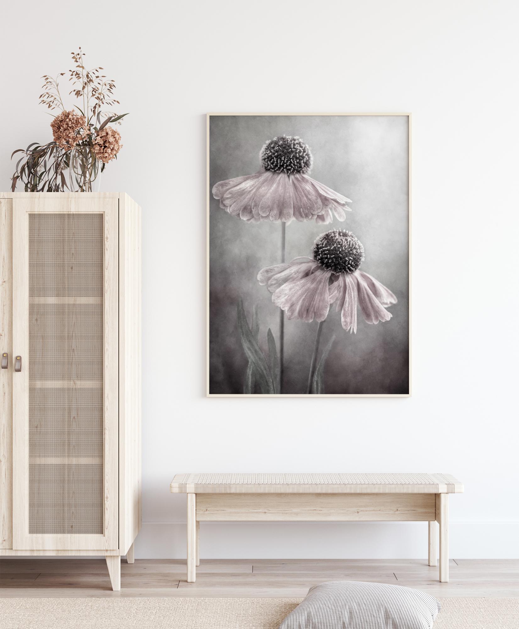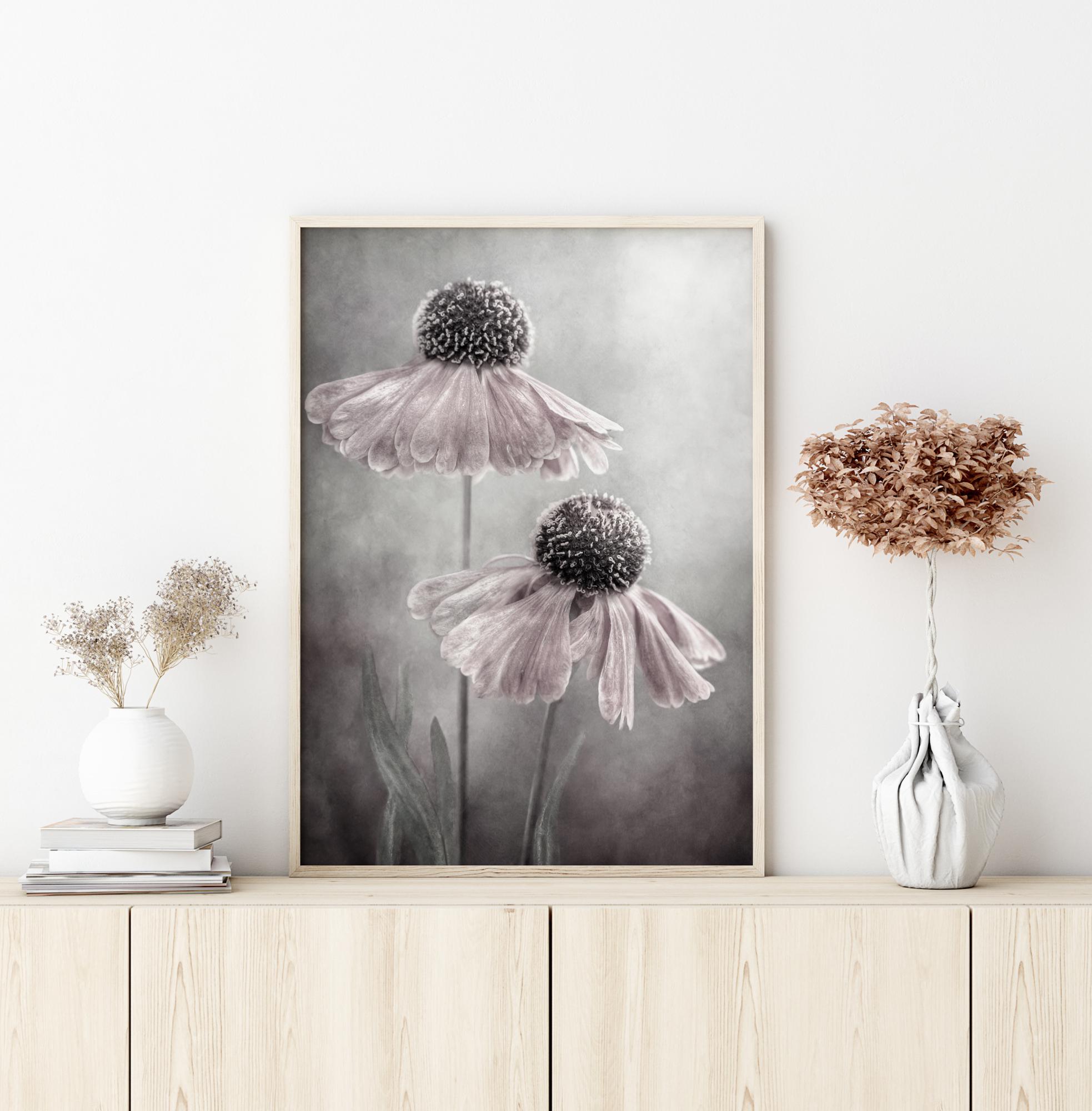 Une belle affiche de deux marguerites qui s'élèvent vers le ciel. Les pétales blancs de chaque tête de marguerite retombent autour du centre sphérique de la fleur. L'arrière-plan est d'un gris brumeux et la lumière transparaît pour créer une ambiance. Ressentez la magie de ce poster délicat en l’accrochant dans une chambre à coucher.