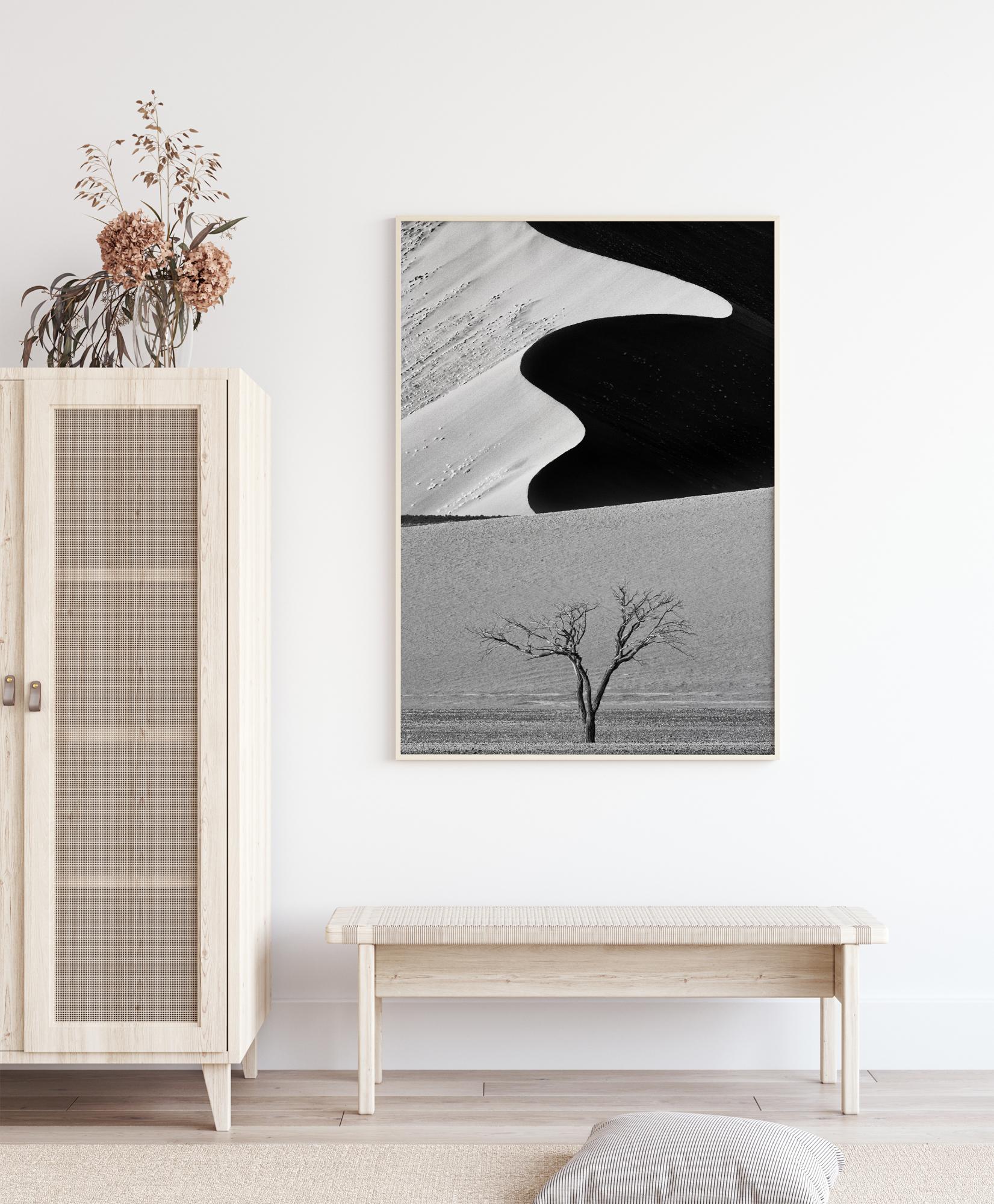 Une affiche spectaculaire de dunes incurvées avec un arbre isolé. Cette image austère juxtapose les courbes noires et blanches de la dune et le calme statique de l'arbre. Créez un sentiment d'émerveillement avec cette œuvre.