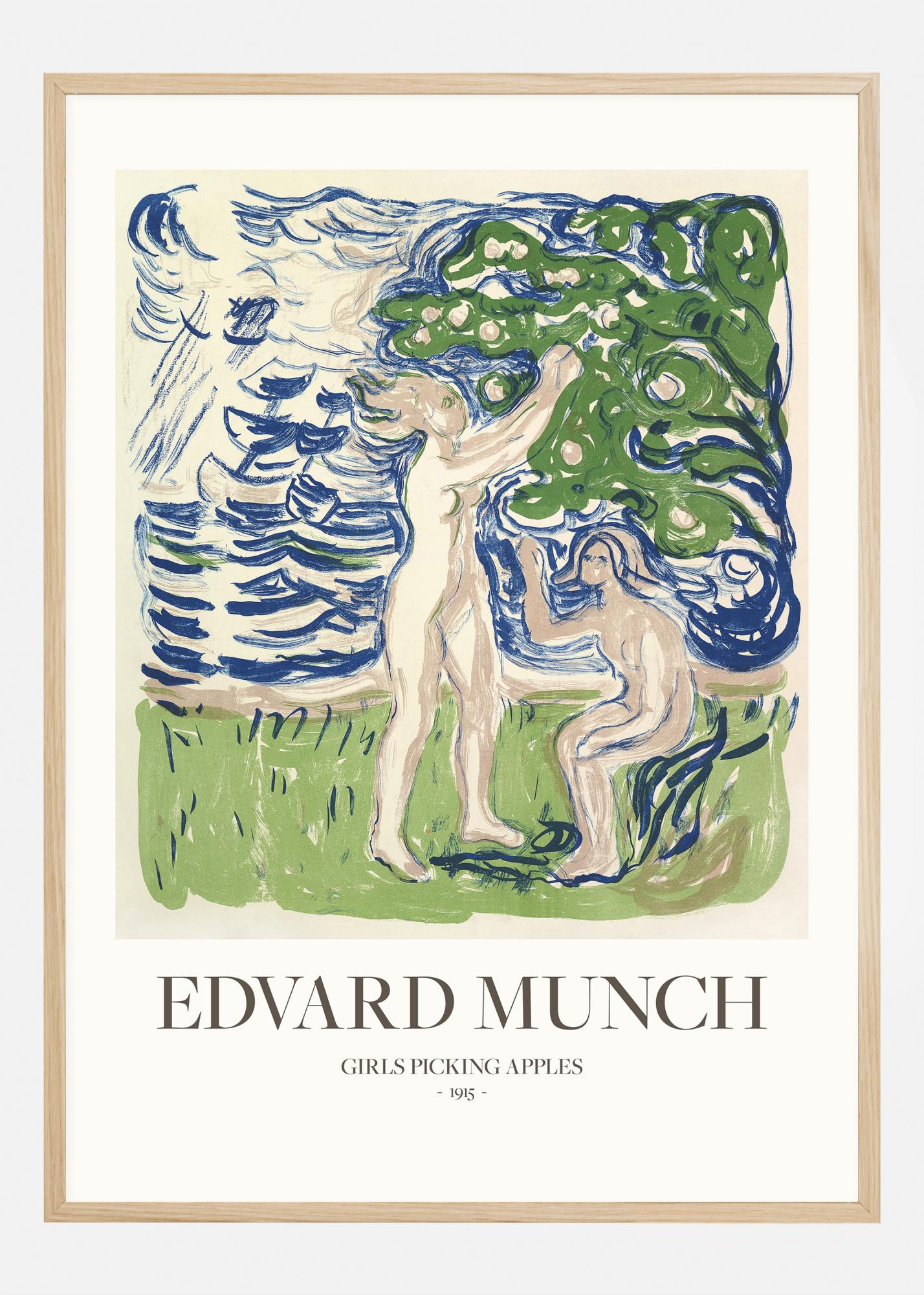 Cette affiche représente 'Girls Picking Apples', une œuvre de 1915 d'Edvard Munch, qui capture une scène idyllique et atmosphérique. L'œuvre offre une représentation simple mais expressive de deux figures parmi les arbres, leurs corps et visages soulignés par des coups de pinceau lâches et libres. Le schéma de couleurs est dominé par un vert frais et un brun terreux qui créent la pelouse et les troncs d'arbres, tandis que le ciel bleu et blanc fournit un arrière-plan vif qui met en valeur les tons verts pomme clairs et les teintes chair douces. Cette impression est un hommage au simple plaisir de la vie et constitue une touche artistique parfaite pour donner à n'importe quelle pièce une sensation de nature et de liberté.