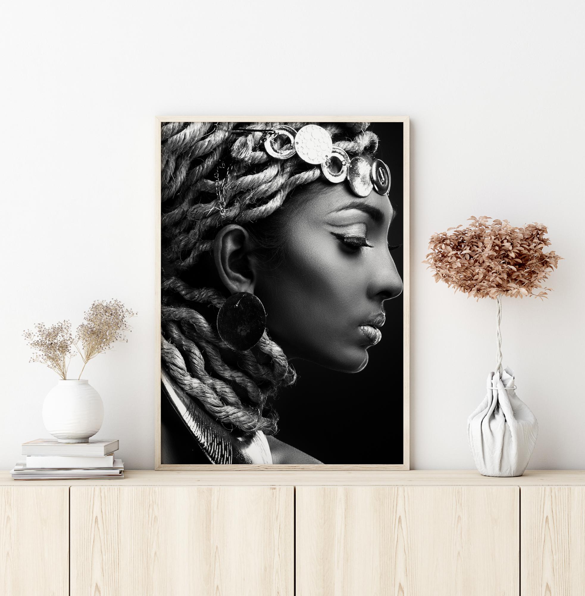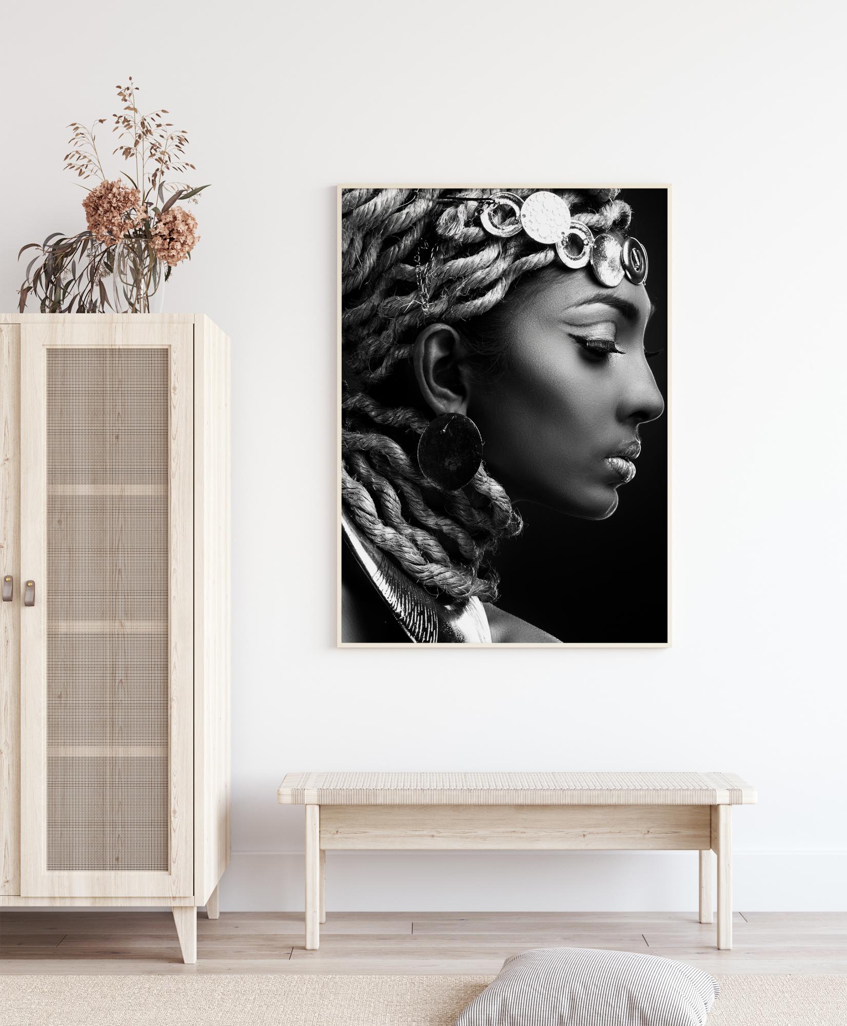 Un portrait étonnant du profil d'une femme habillée dans le style de l'Égypte ancienne. Cette image en noir et blanc crée un sentiment de drame alors que cette belle femme regarde impérieusement vers le bas. Sa tête, ses oreilles et son cou sont couverts de grands bijoux en or, symbole de richesse. Laissez-vous inspirer chaque jour par cette femme forte.